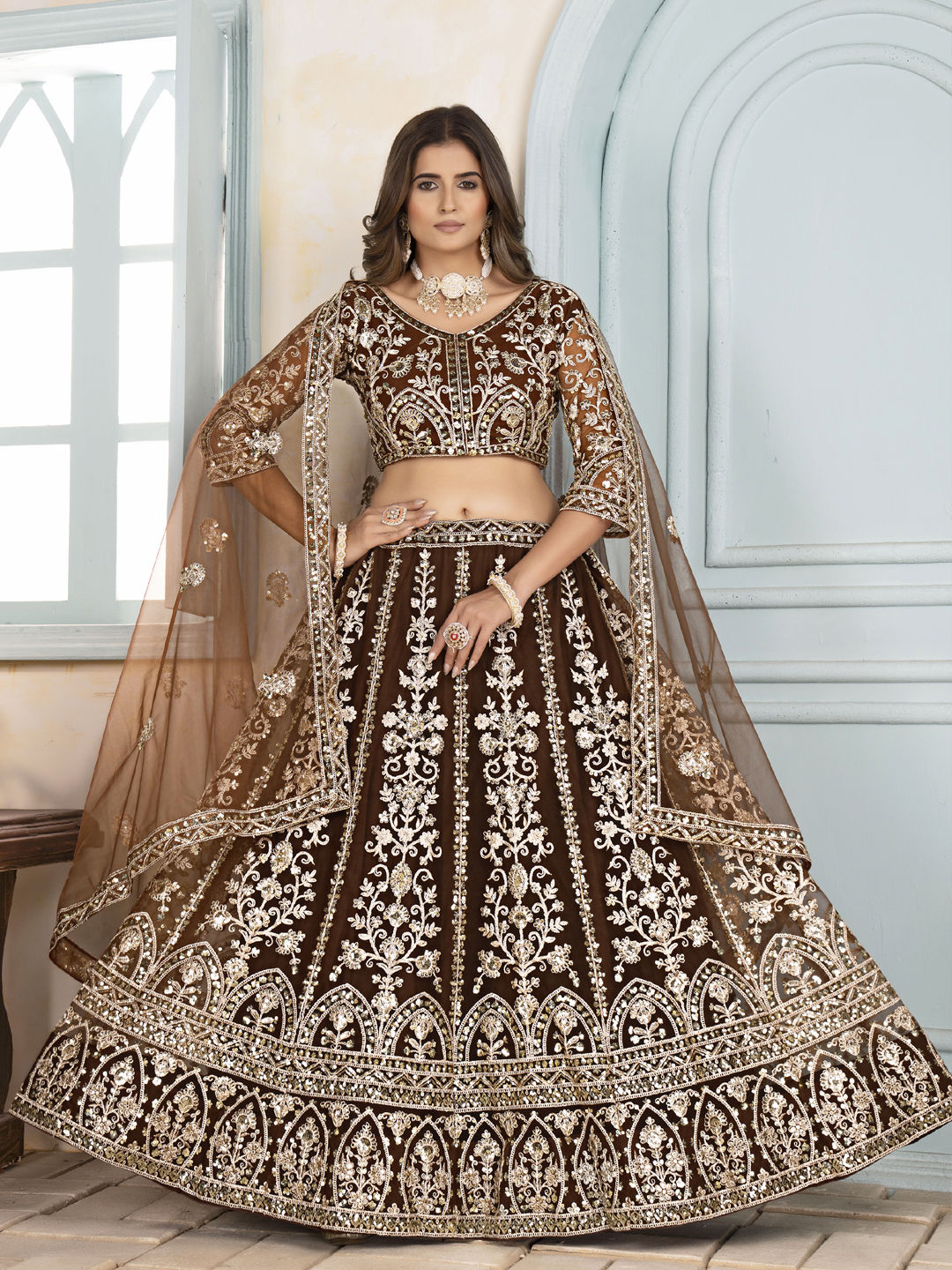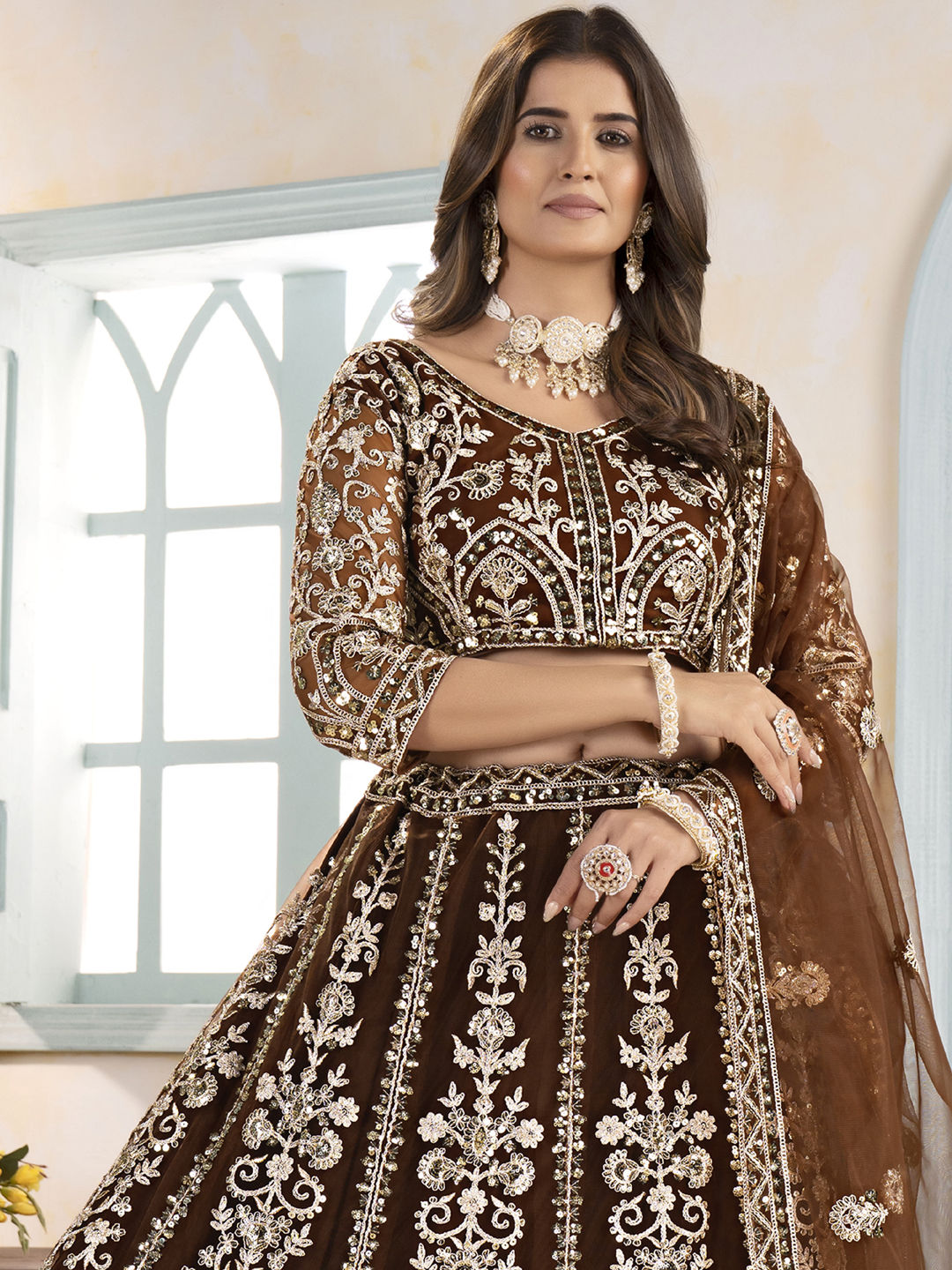 Beige and Brown color Lehenga in Net fabric with Embroidered, Sequence work