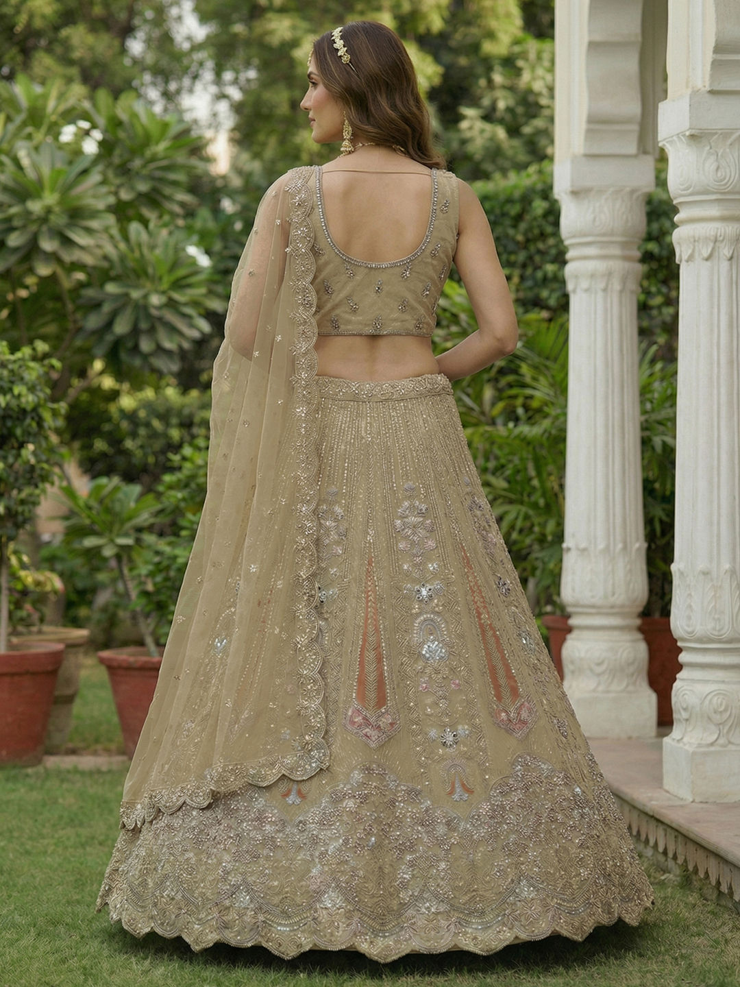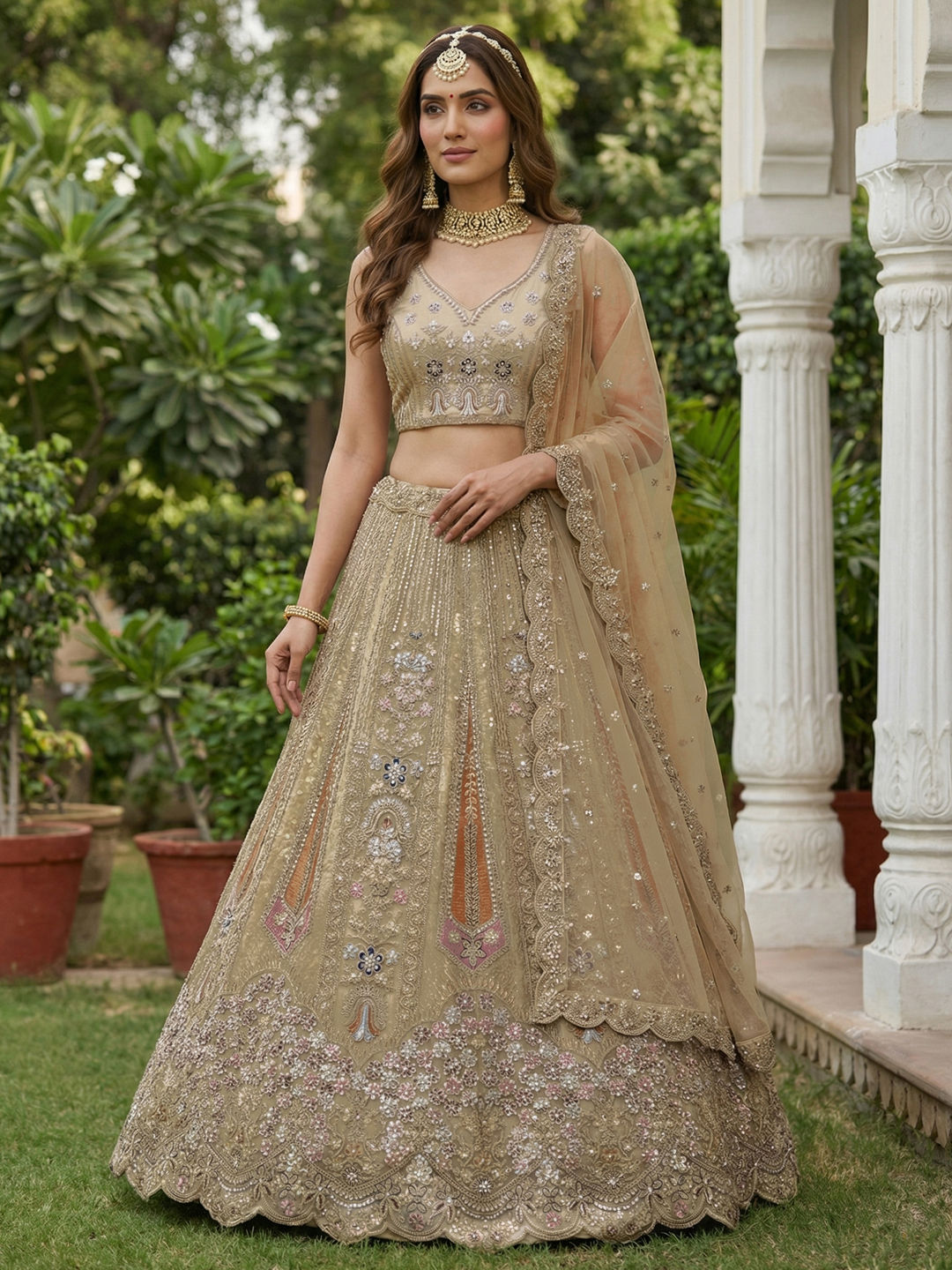 Beige and Brown color Lehenga in Net fabric with Embroidered, Resham, Thread work