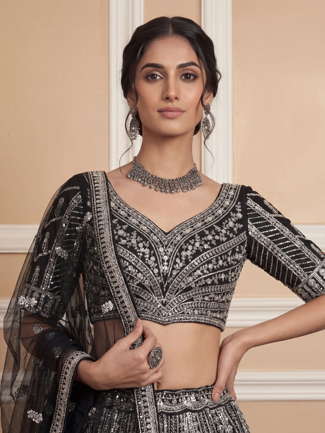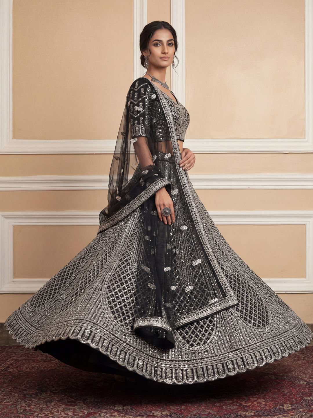 Black and Grey color Lehenga in Net fabric with Embroidered, Sequence, Thread work