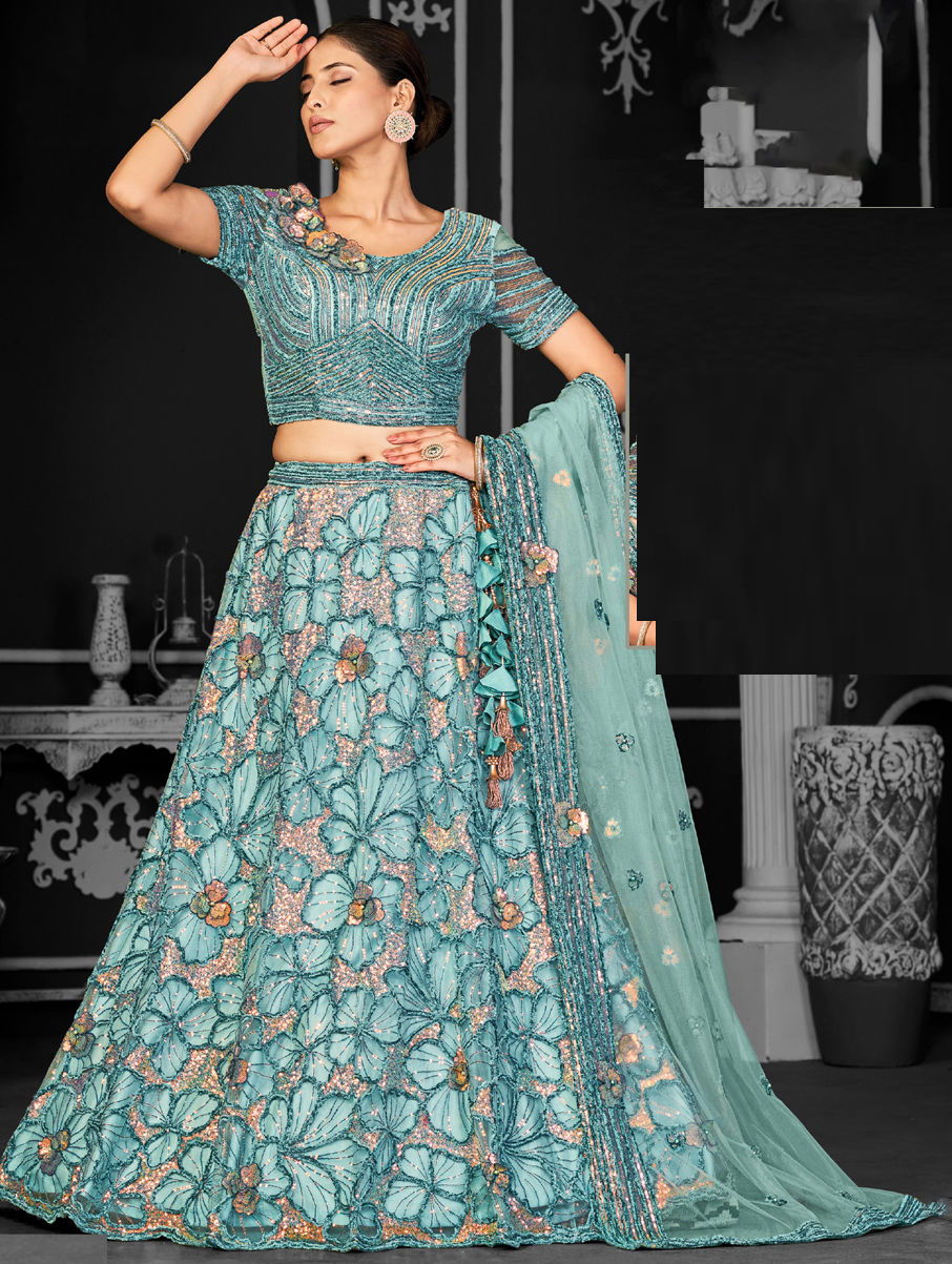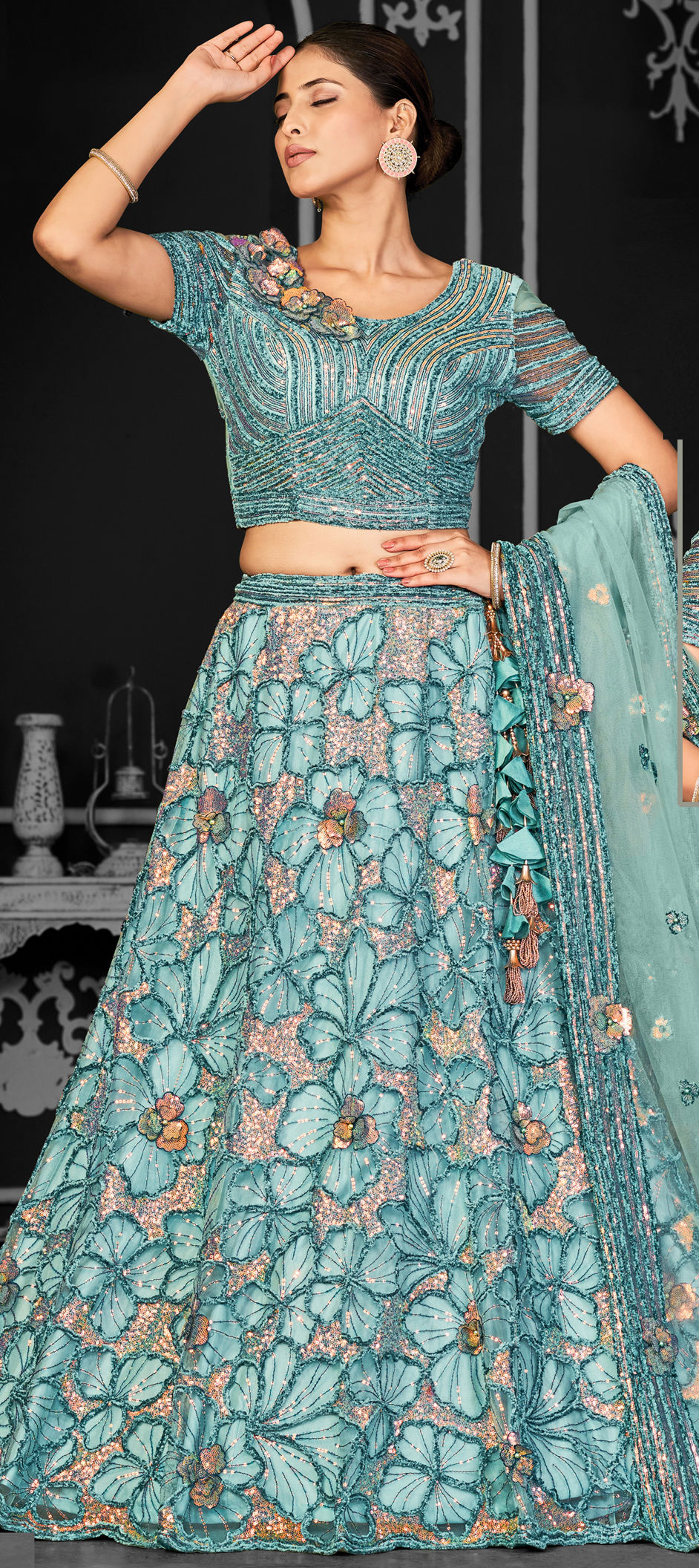 Blue color Lehenga in Net fabric with Embroidered, Sequence, Thread work