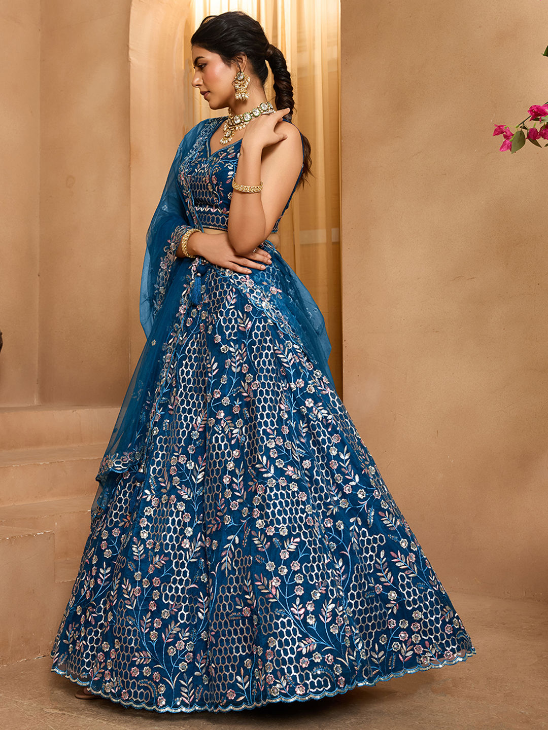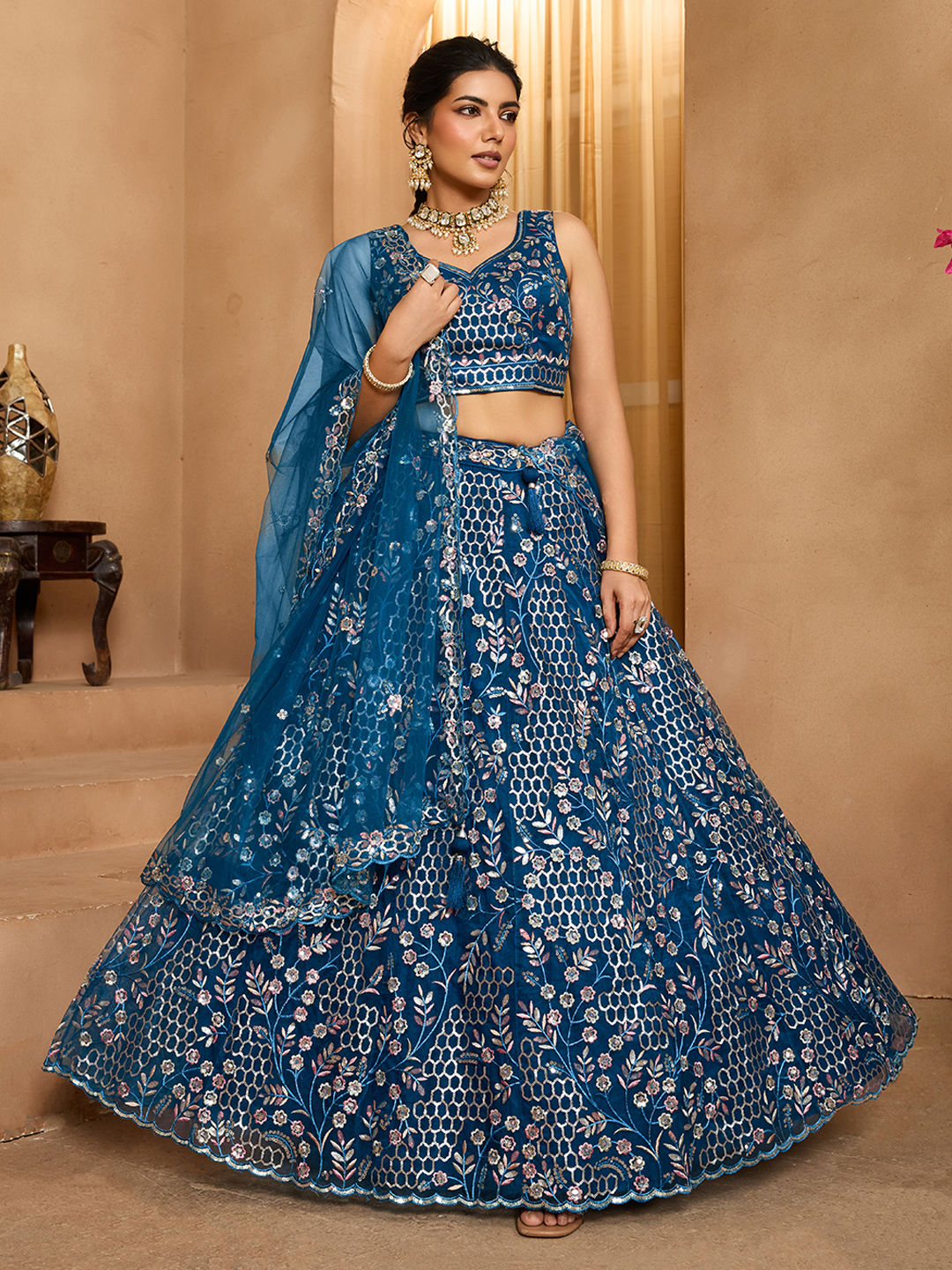 Blue color Lehenga in Net fabric with Embroidered, Sequence, Stone, Thread work