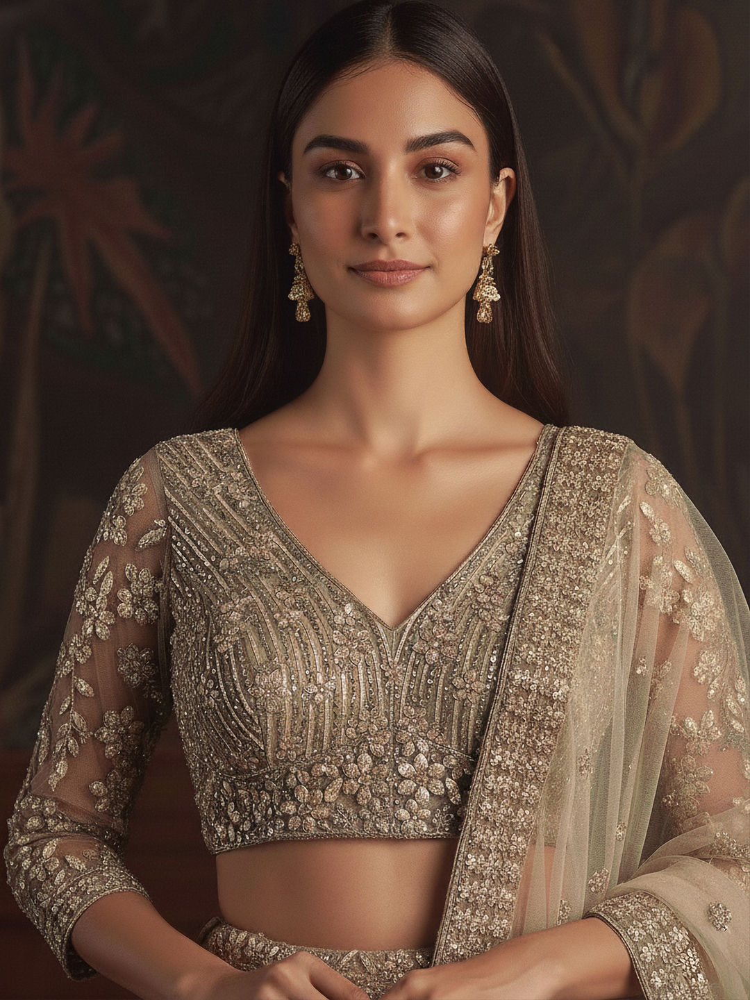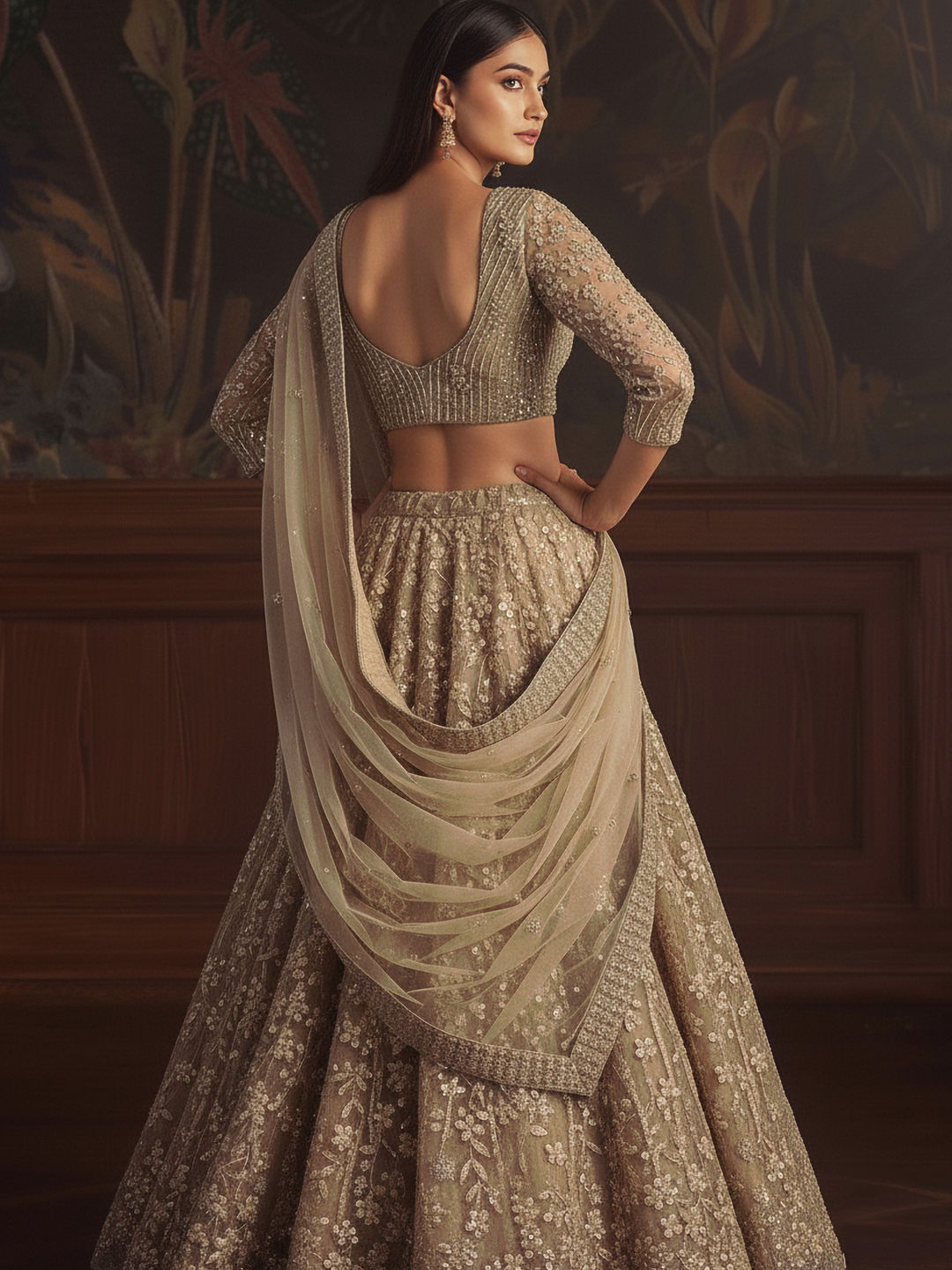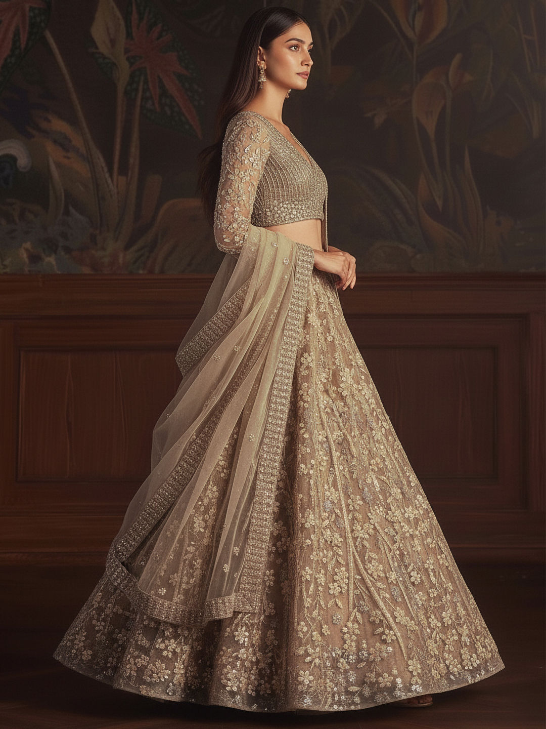 Gold color Lehenga in Net fabric with Embroidered, Sequence, Zircon work