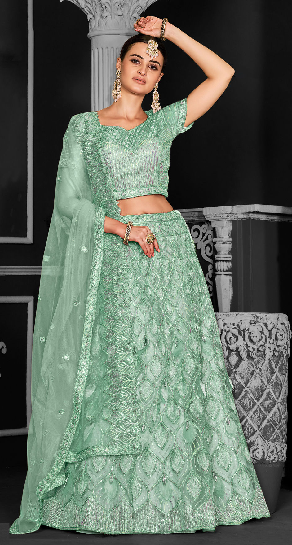 Green color Lehenga in Net fabric with Embroidered, Sequence, Thread work