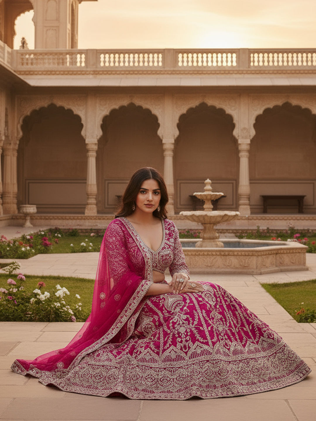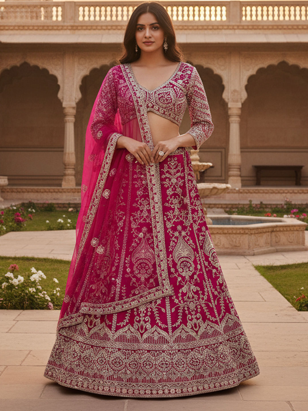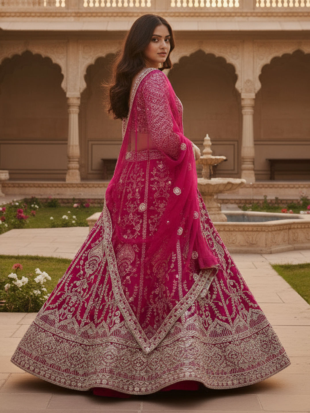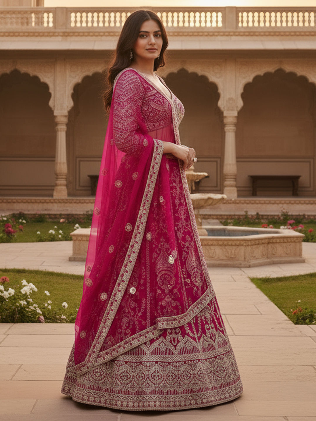Pink and Majenta color Lehenga in Net fabric with Embroidered, Thread work