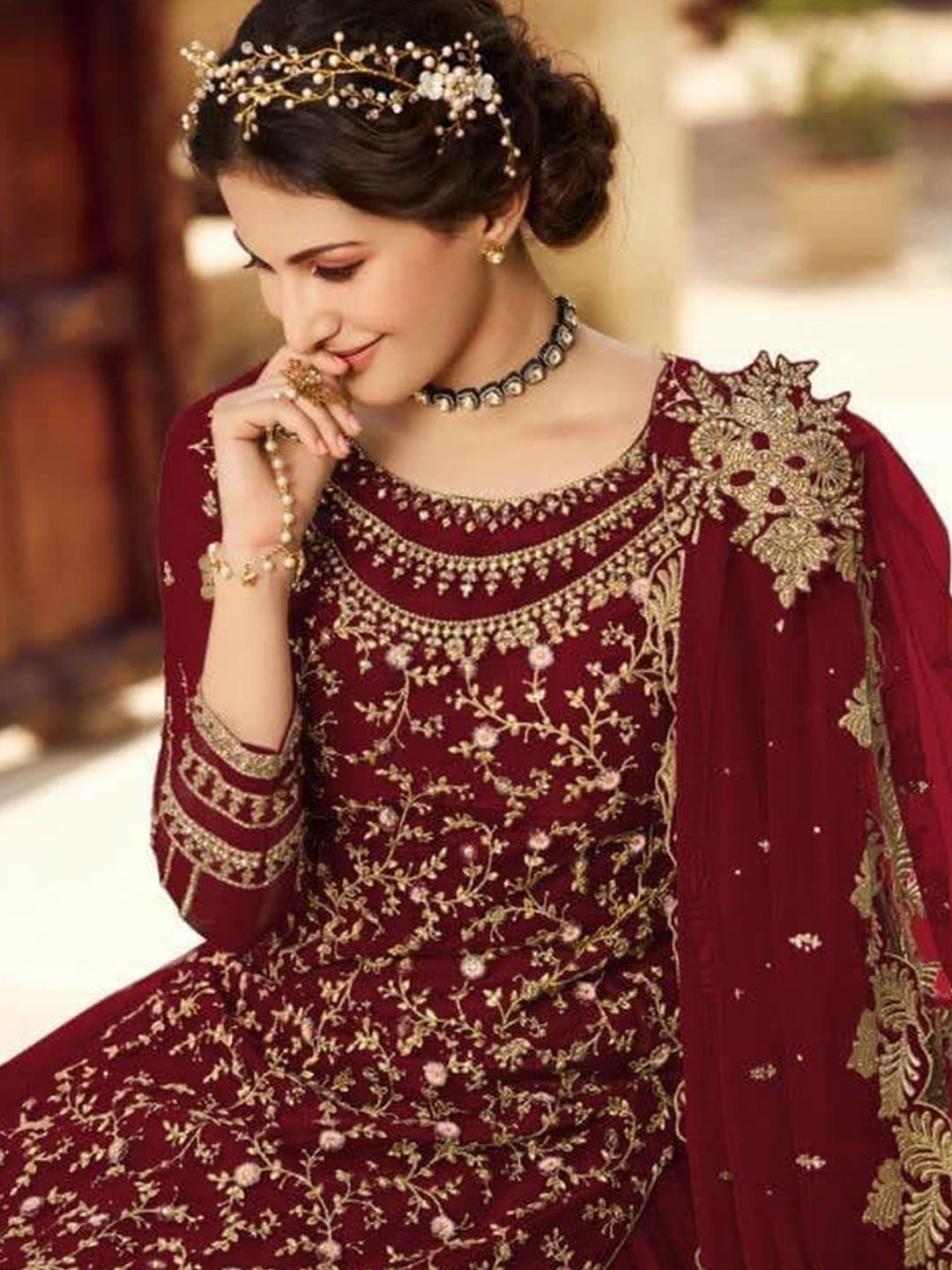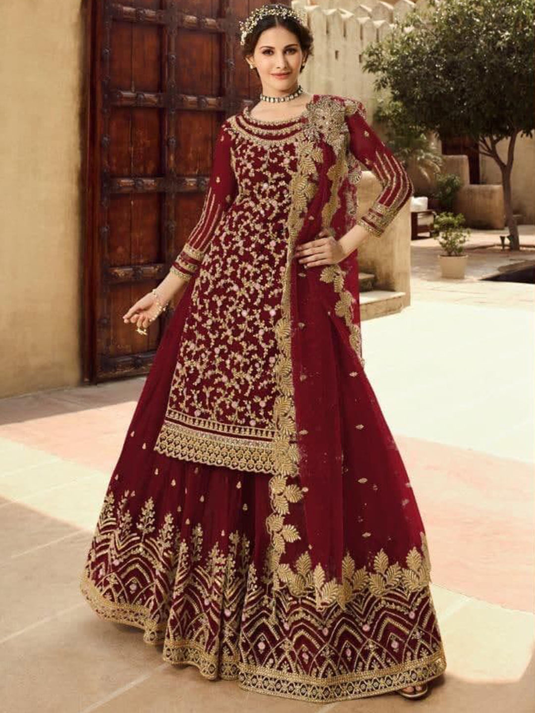 Red and Maroon color Salwar Kameez in Net fabric with Embroidered, Sequence, Thread, Zari work