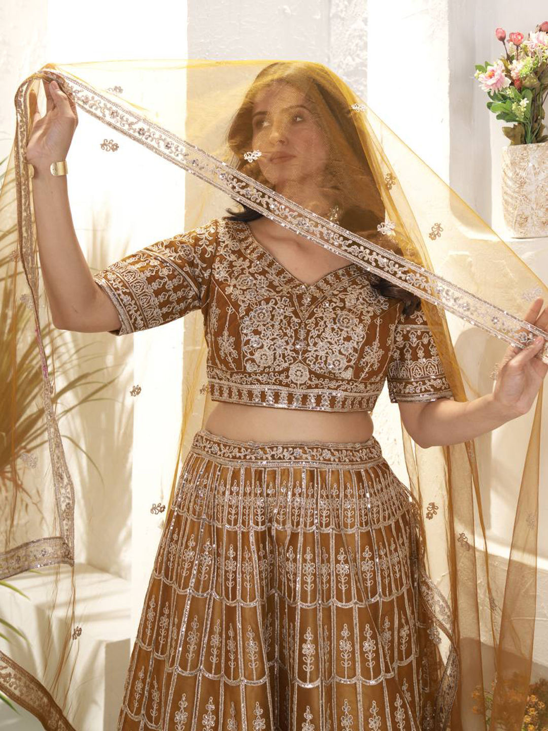 Beige and Brown color Lehenga in Net fabric with Embroidered, Sequence, Thread work