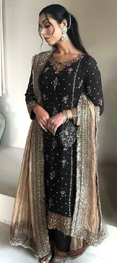 Net Party Wear Salwar Kameez in Black and Grey with Thread work