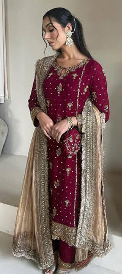 Net Party Wear Salwar Kameez in Red and Maroon with Sequence work