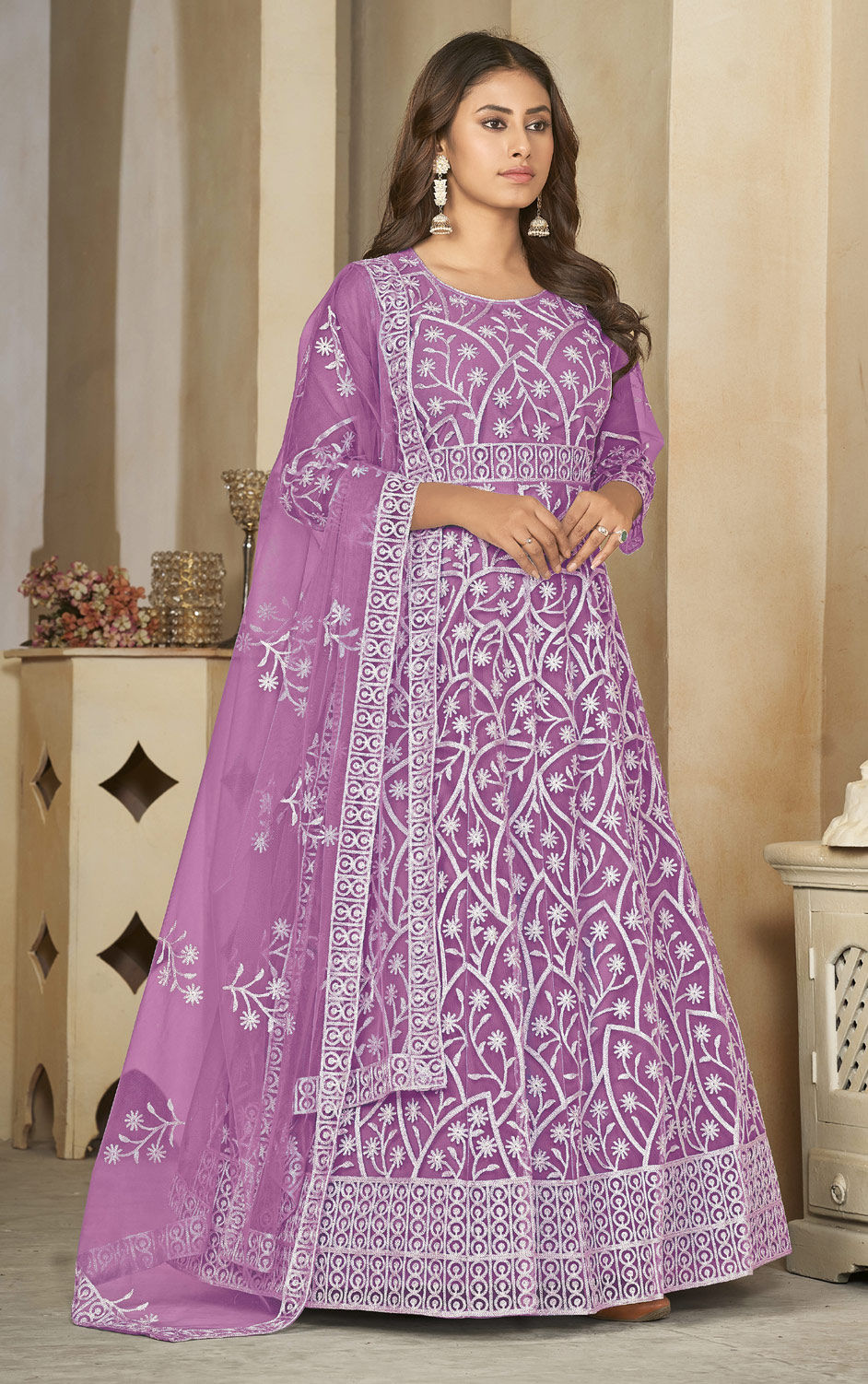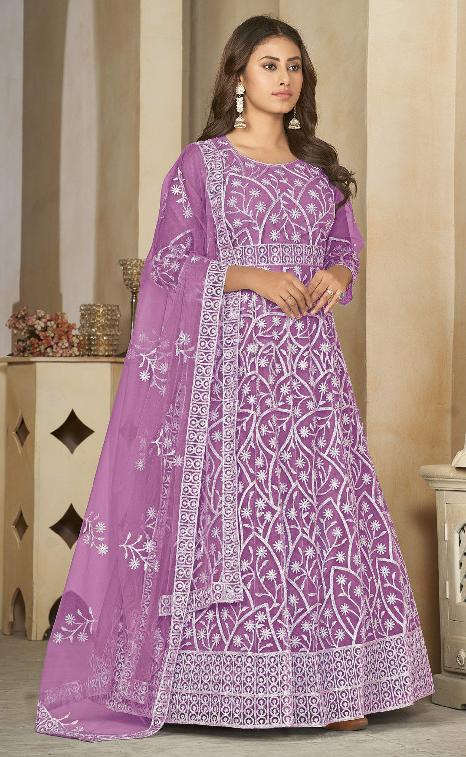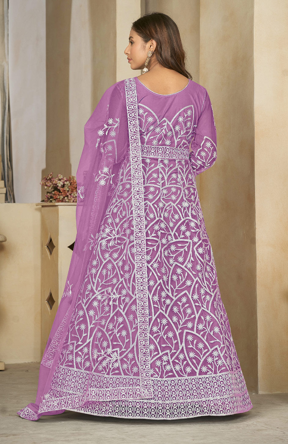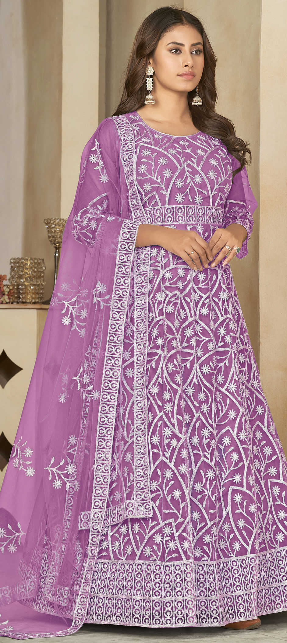 Purple and Violet color Salwar Kameez in Net fabric with Embroidered, Resham, Thread work