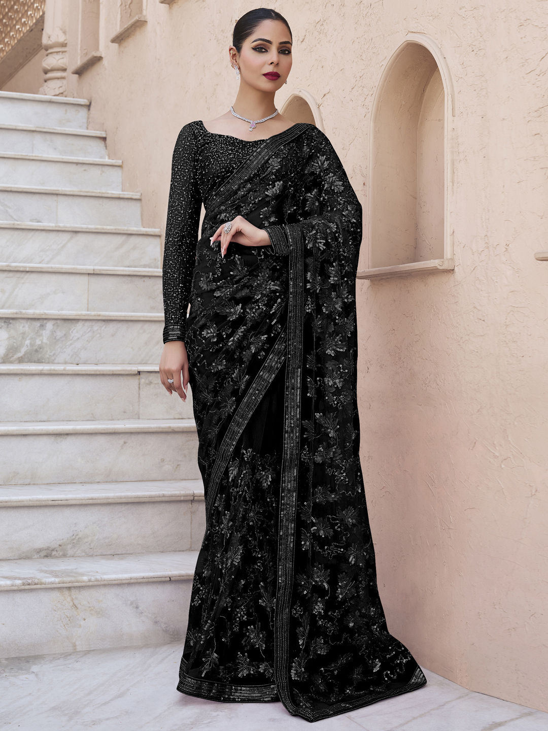 Black and Grey color Saree in Net fabric with Bugle Beads, Cut Dana, Sequence work