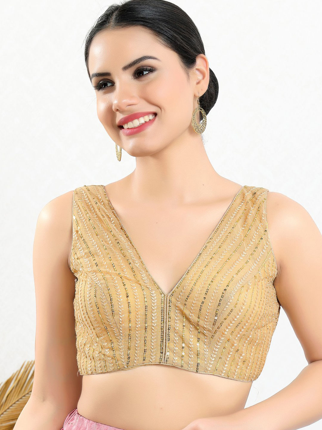 Gold color Blouse in Net fabric with Embroidered, Sequence, Thread work