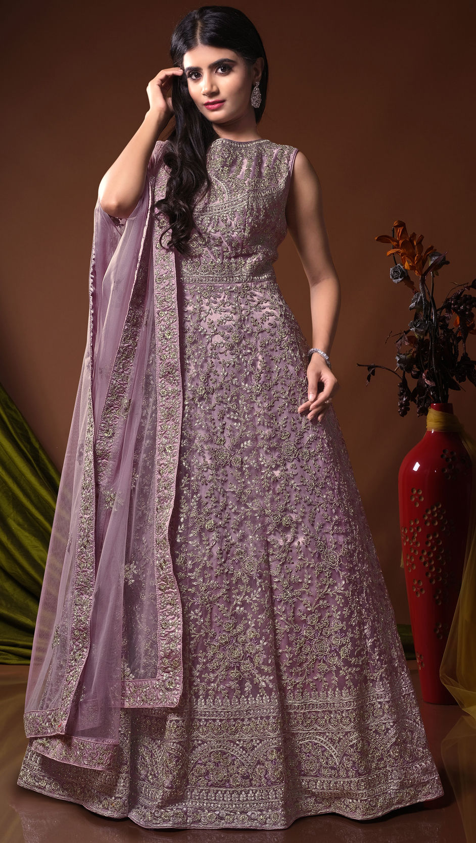 Purple and Violet color Gown in Net fabric with Embroidered, Resham, Sequence, Thread work
