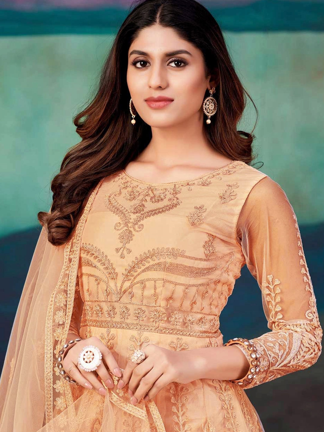Net Party Wear Salwar Kameez in Beige and Brown with Embroidered work