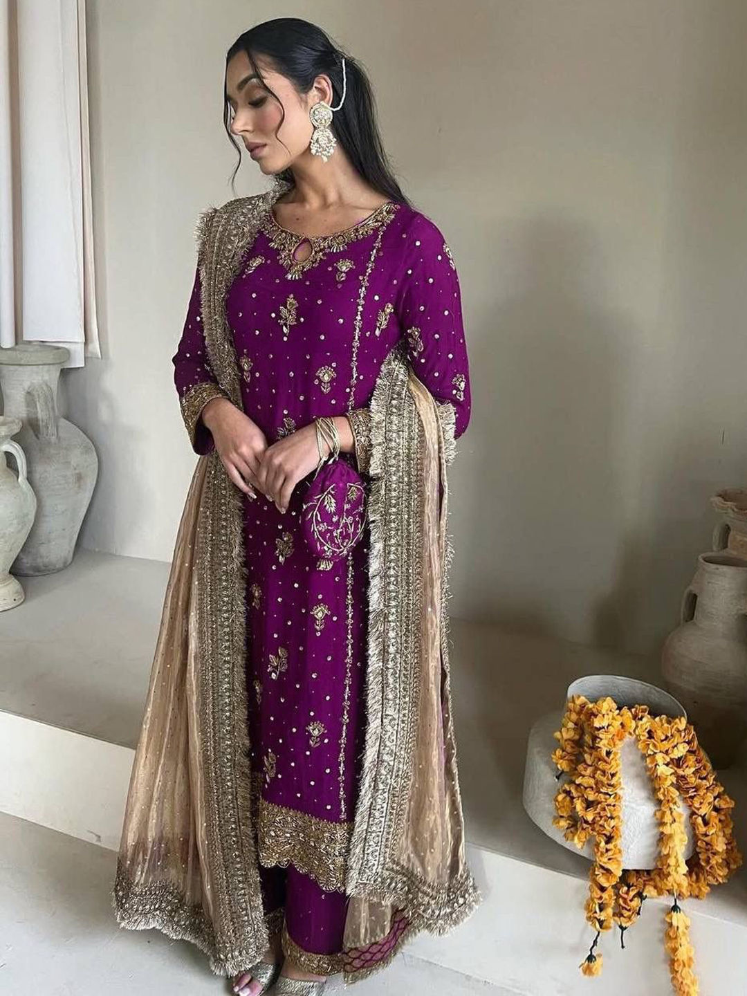 Purple and Violet color Salwar Kameez in Net fabric with Embroidered, Moti, Sequence, Thread work