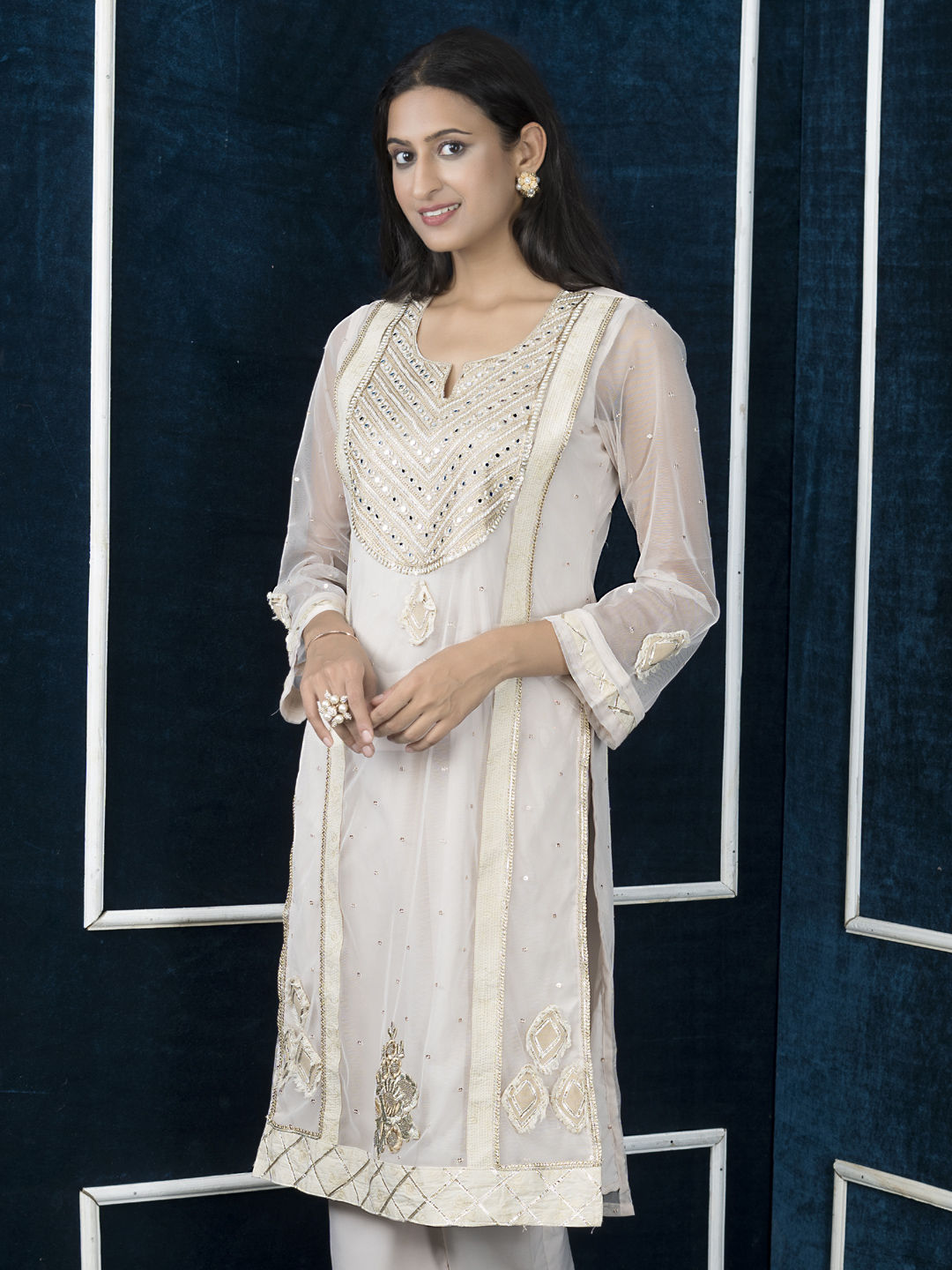 Beige and Brown color Kurti in Net fabric with Embroidered, Thread, Zari work