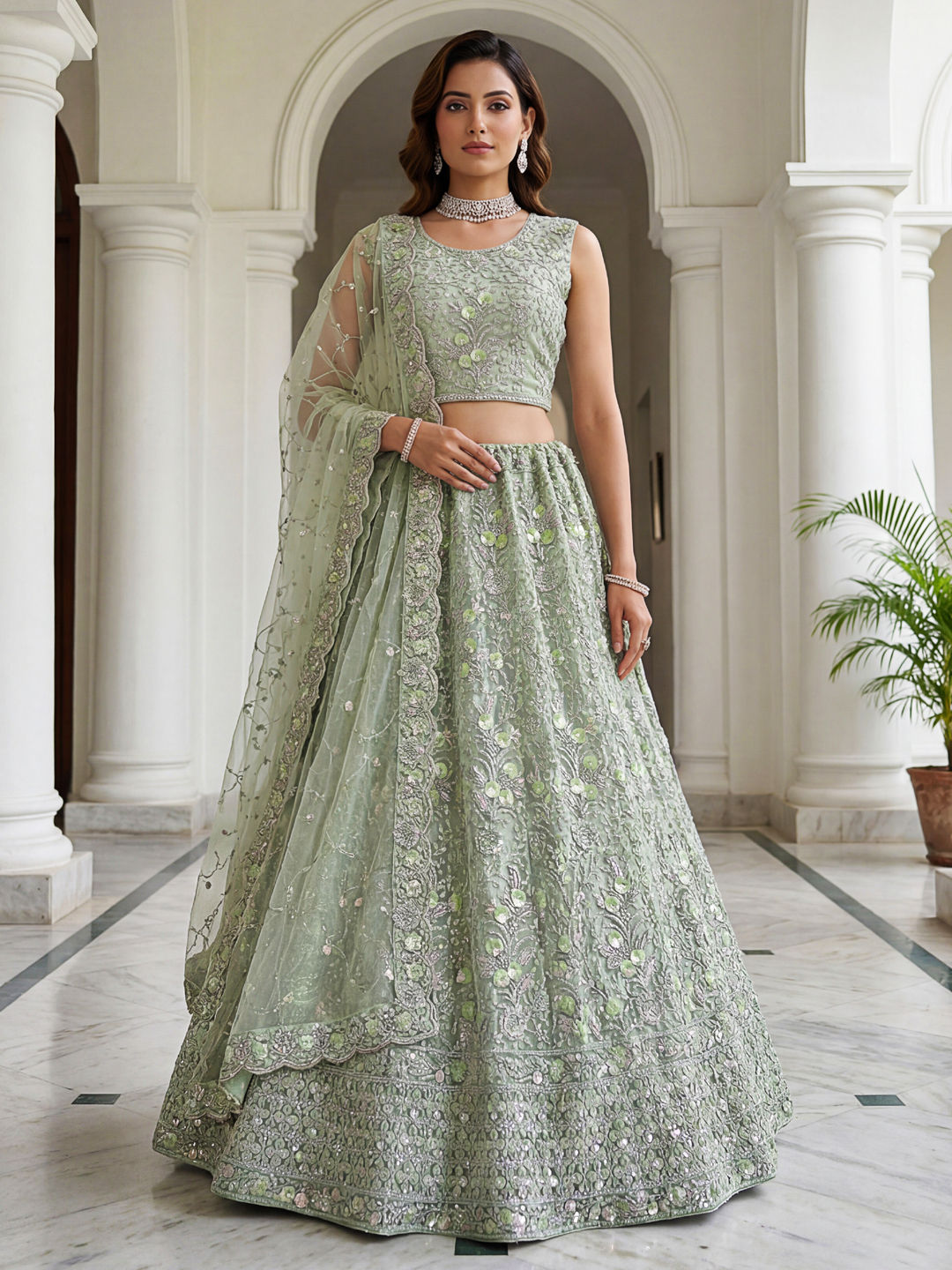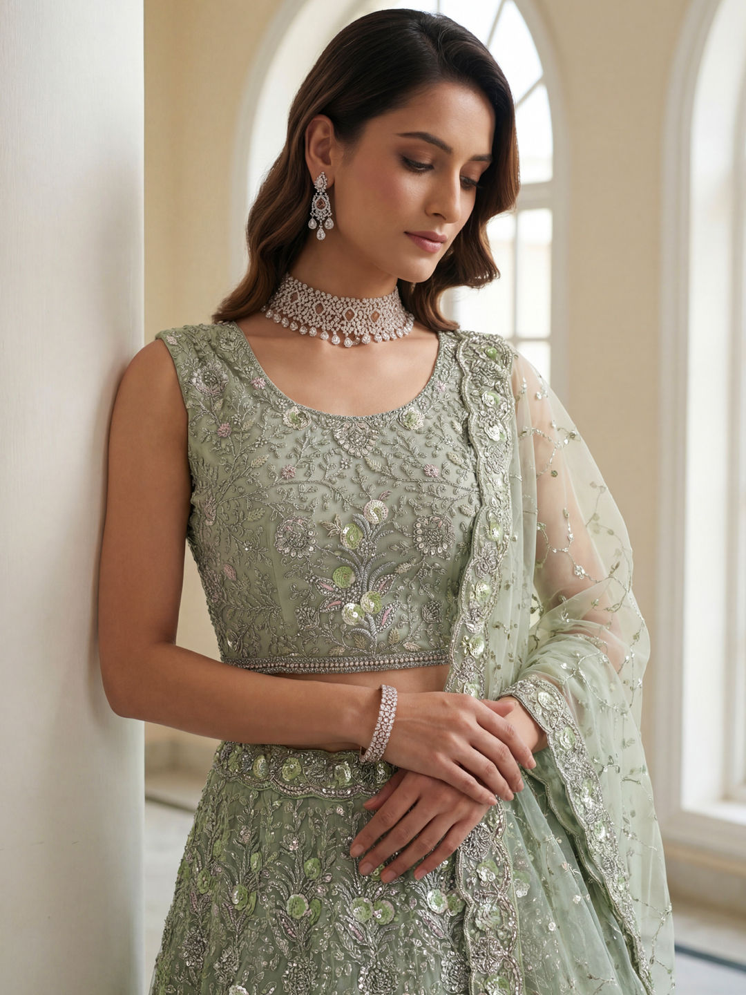 Green color Lehenga in Net fabric with Embroidered, Sequence, Stone, Thread, Zircon work