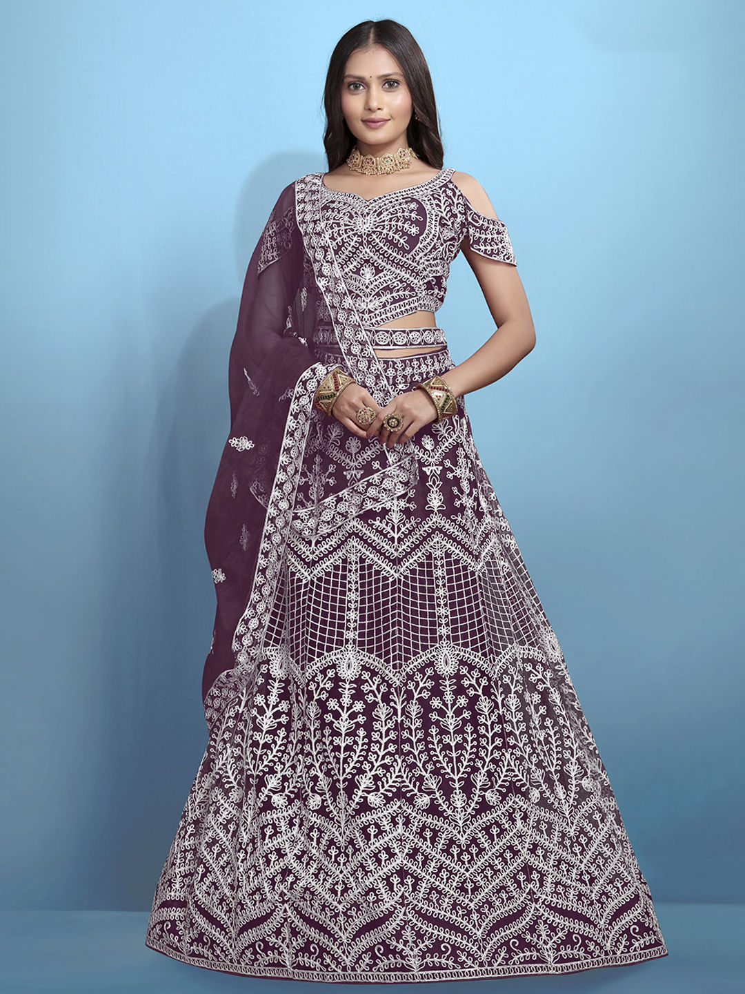 Purple and Violet color Lehenga in Net fabric with Embroidered, Thread work