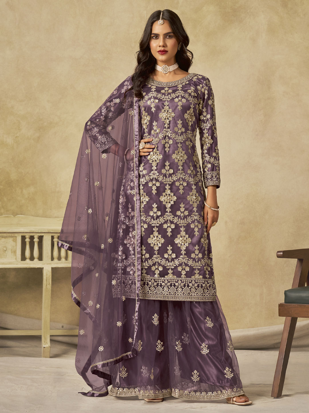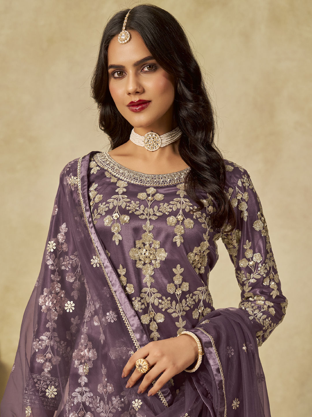 Purple and Violet color Salwar Kameez in Net fabric with Sequence work