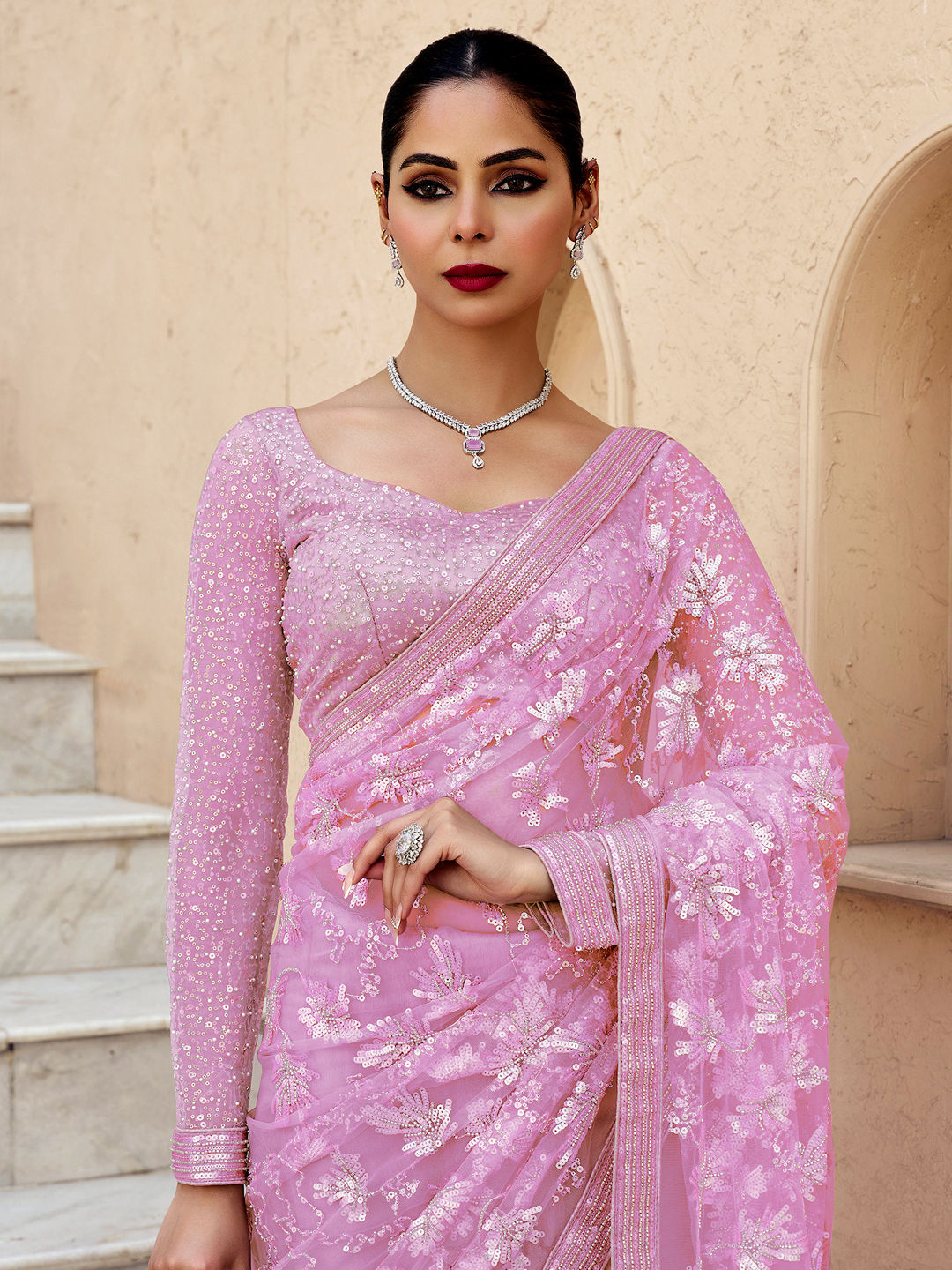 Pink and Majenta color Saree in Net fabric with Bugle Beads, Cut Dana, Sequence work