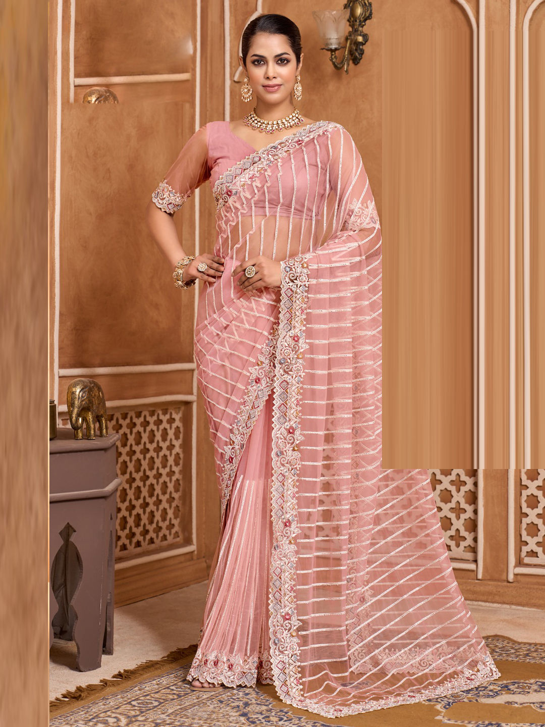 Pink and Majenta color Saree in Net fabric with Embroidered, Sequence, Thread, Zari work