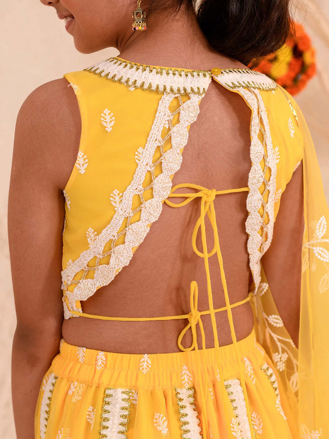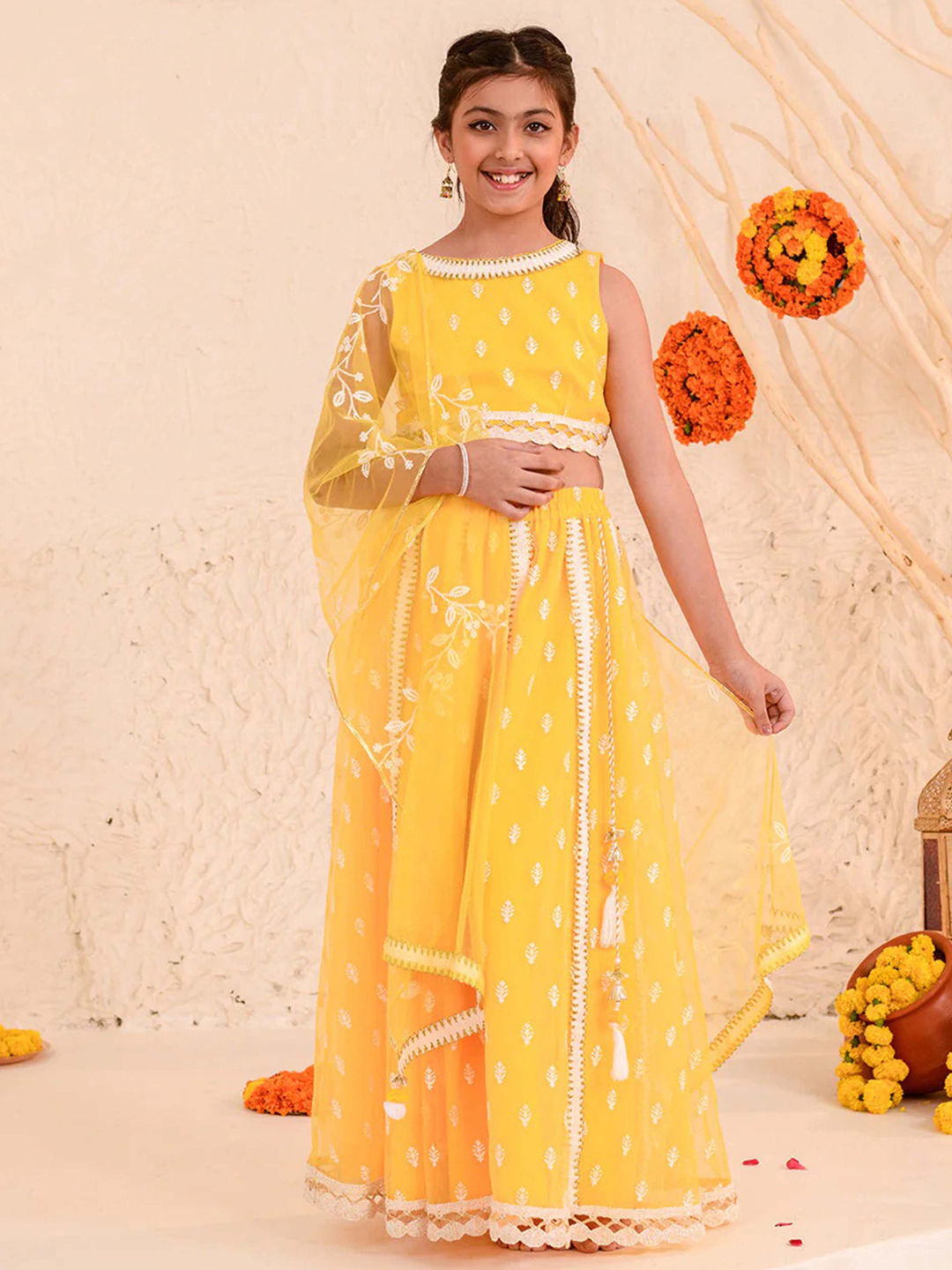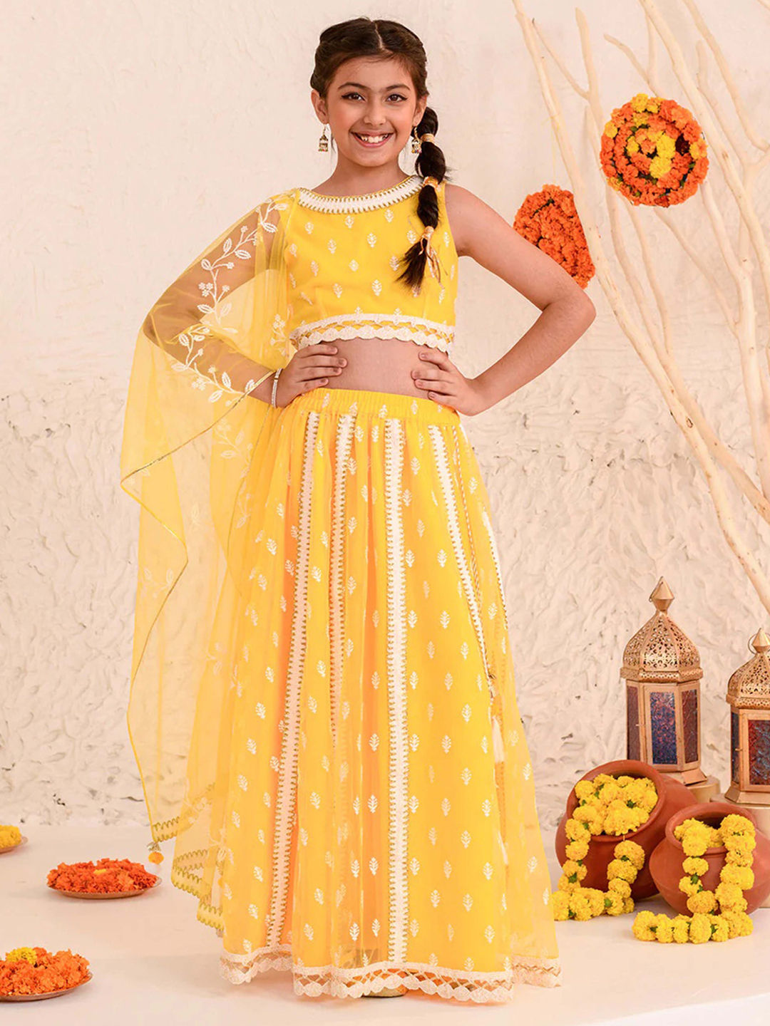 Yellow color Kids Lehenga in Net fabric with Embroidered, Lace work