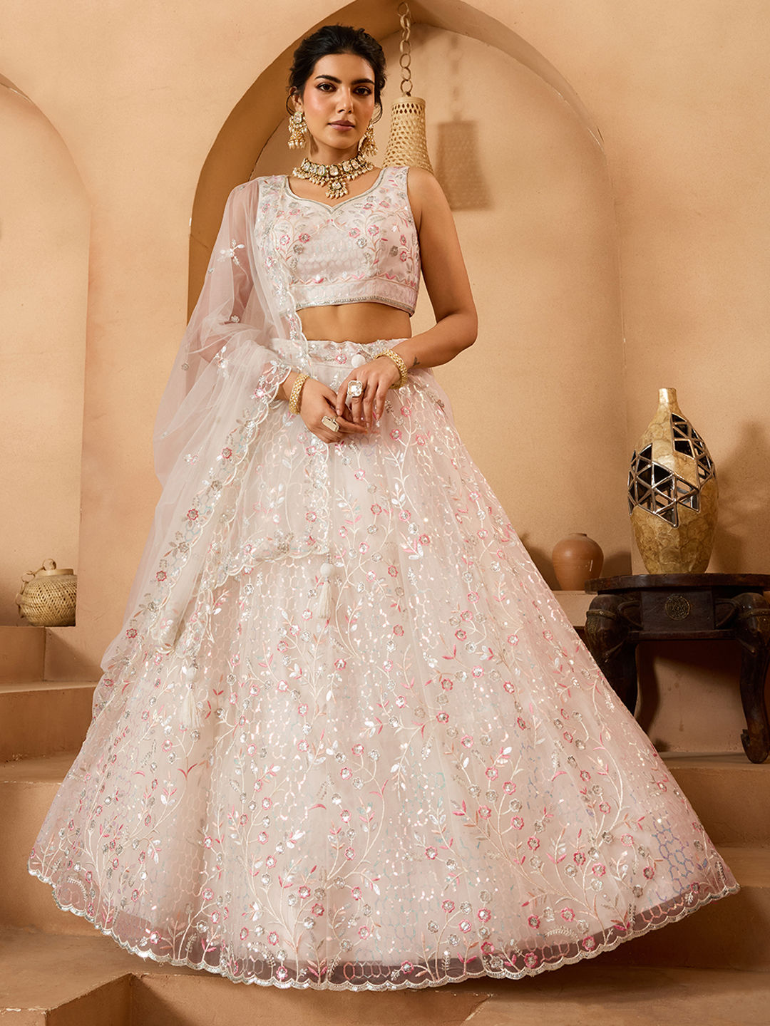 Tissue Bridal Lehenga in White and Off White with Sequence work