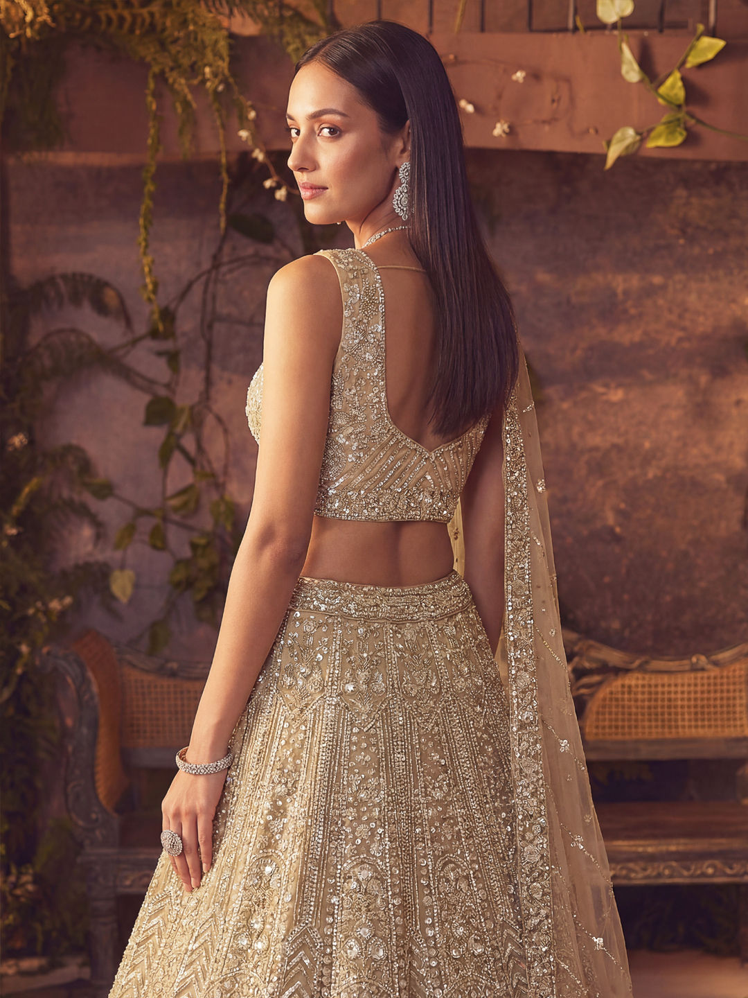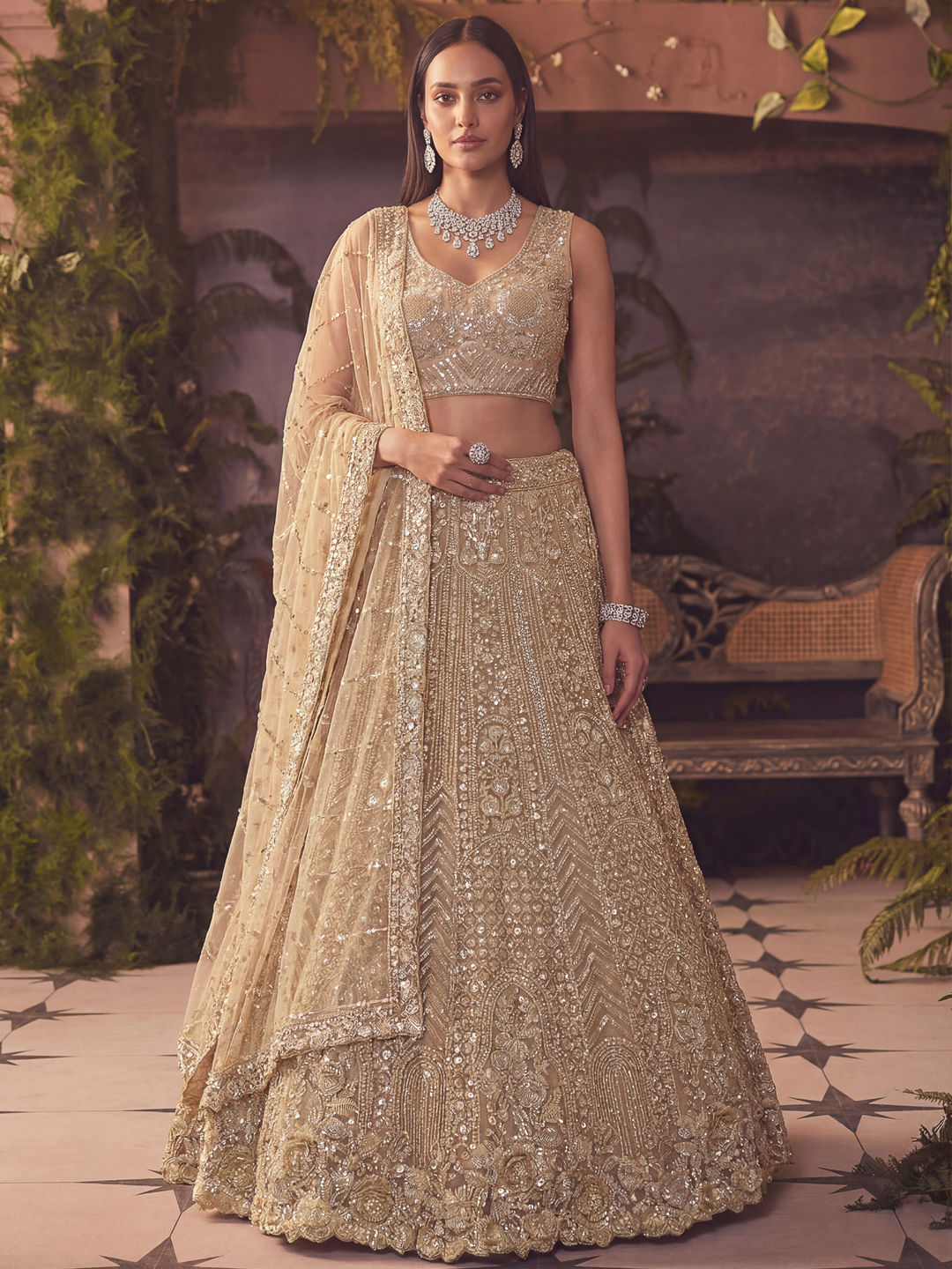 Beige and Brown color Lehenga in Net fabric with Embroidered, Sequence, Thread work
