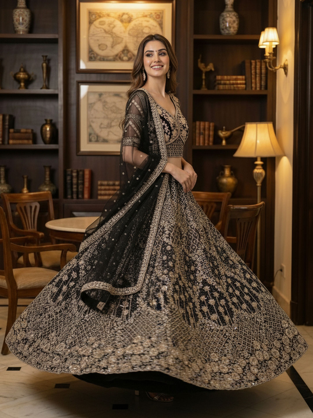 Black and Grey color Lehenga in Net fabric with Embroidered, Sequence, Thread, Zari work