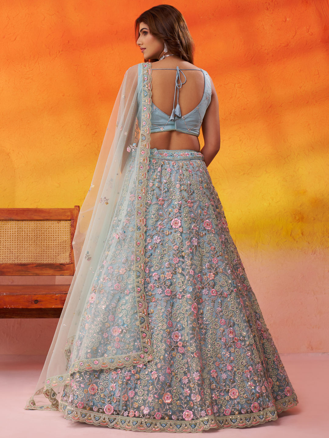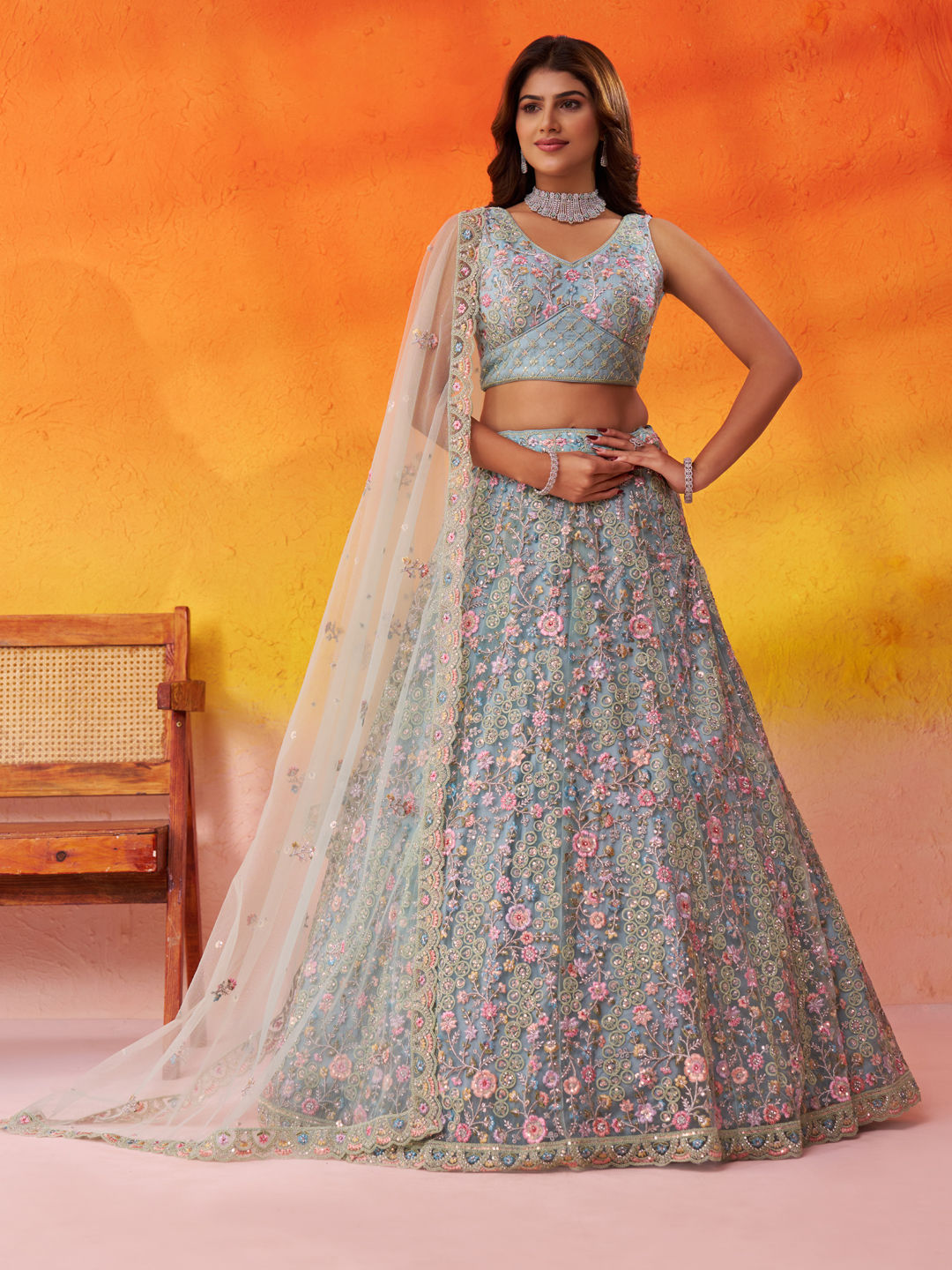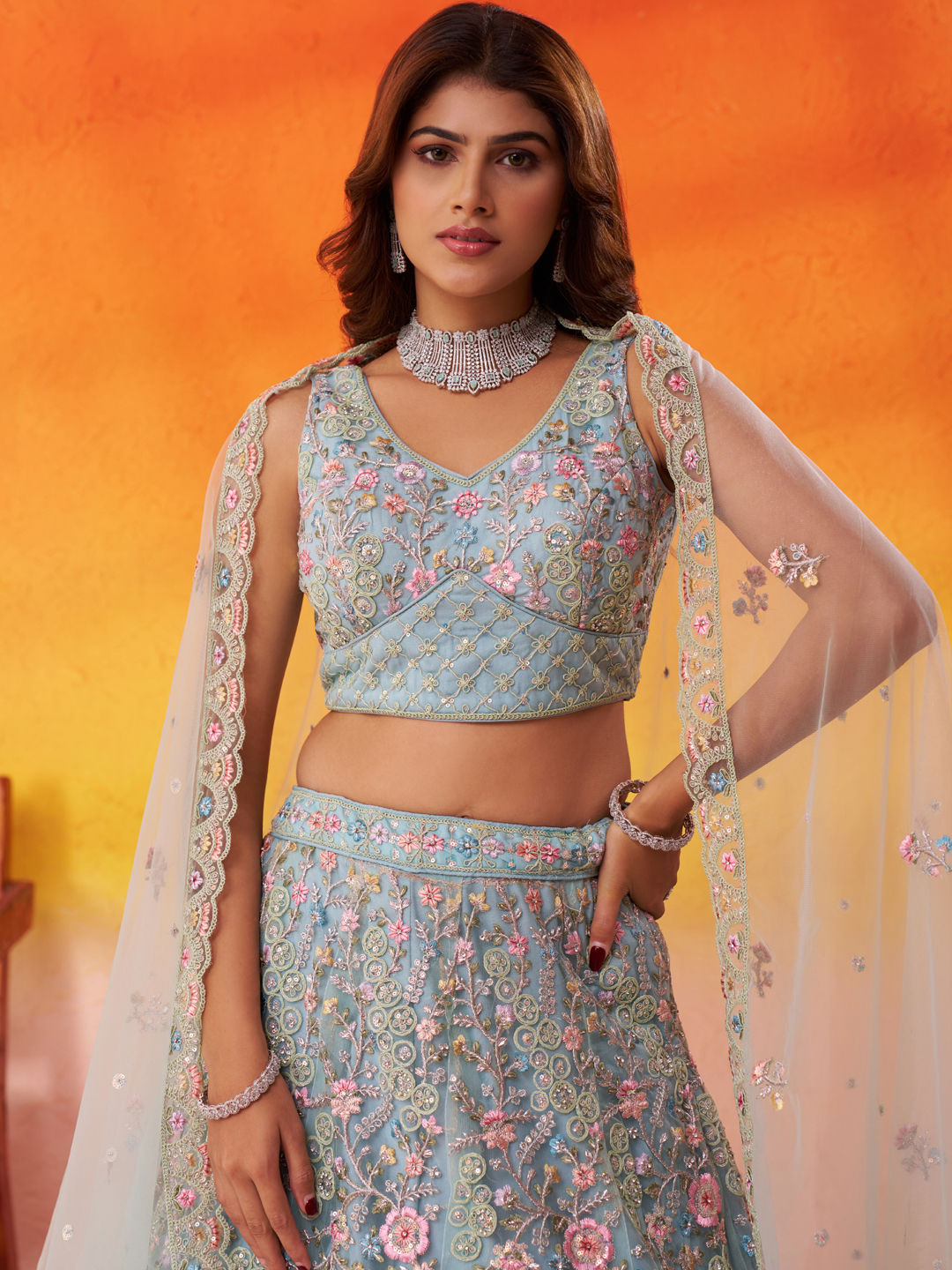 Green color Lehenga in Net fabric with Embroidered, Moti, Sequence, Thread work