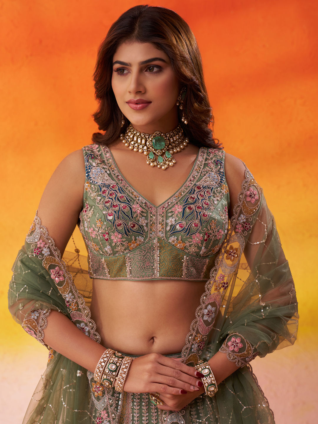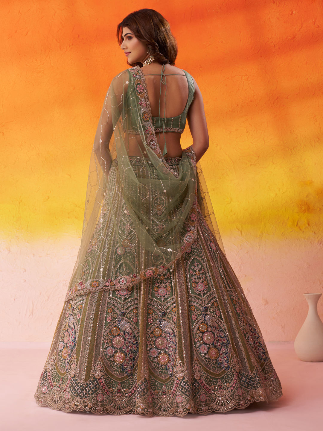 Green color Lehenga in Net fabric with Embroidered, Moti, Sequence, Thread work