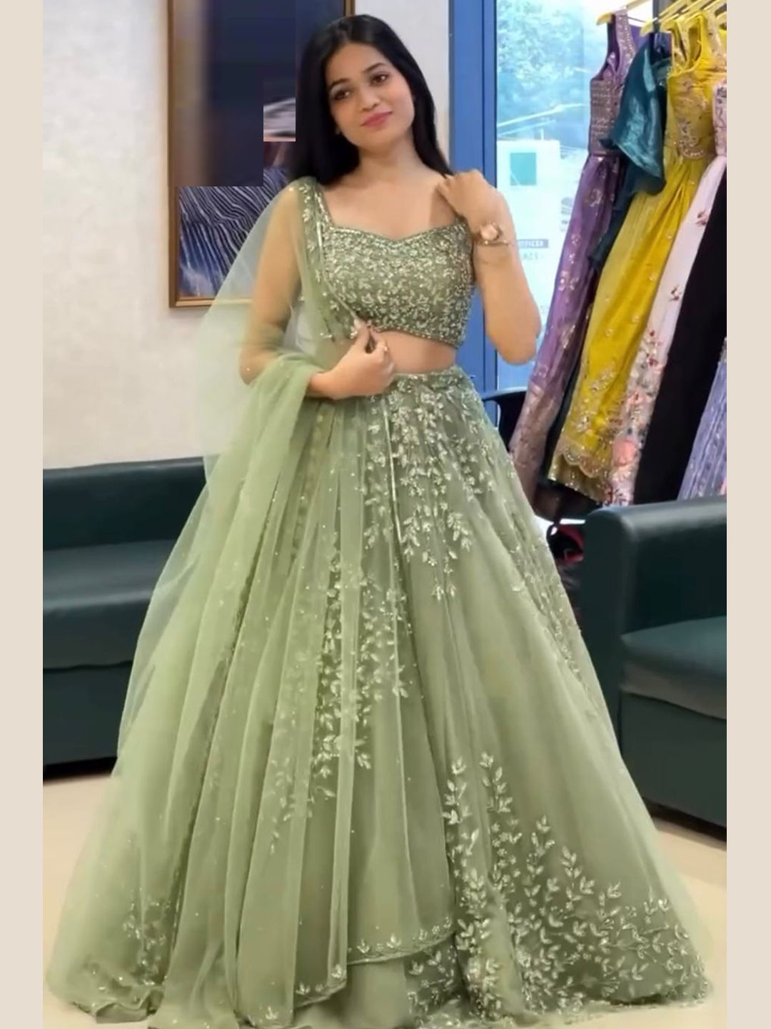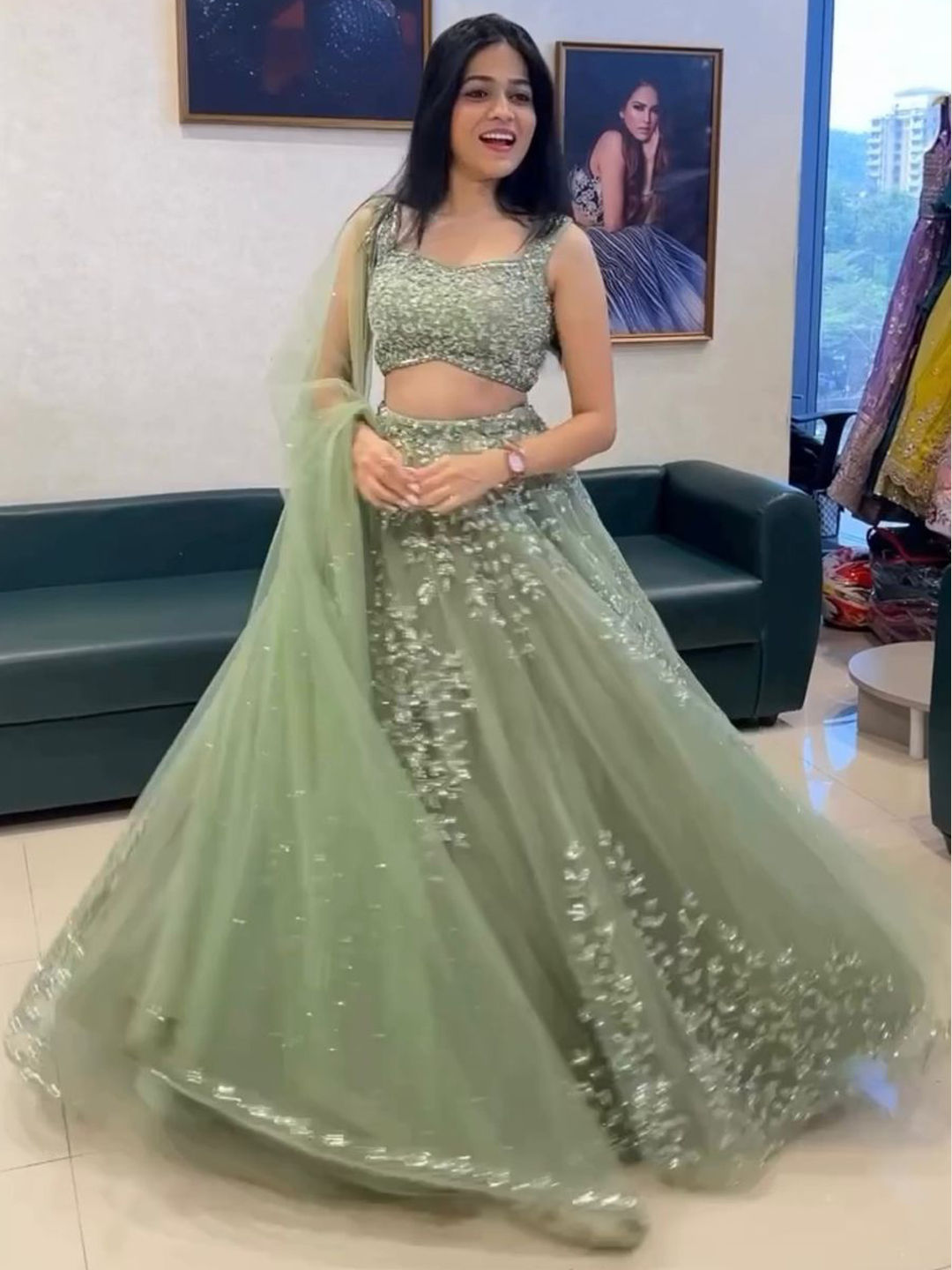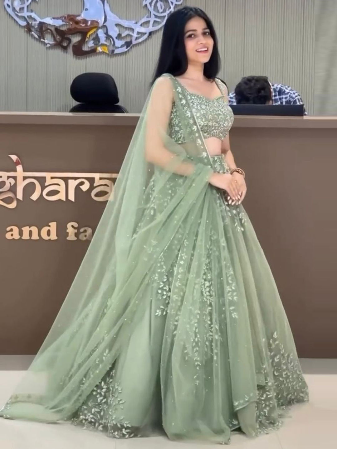 Green color Lehenga in Net fabric with Embroidered, Sequence work