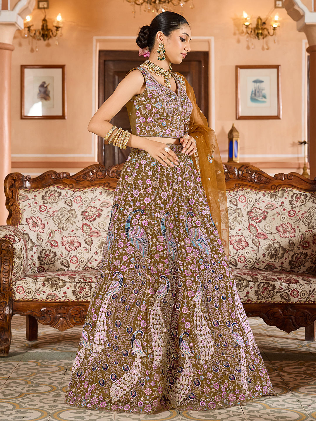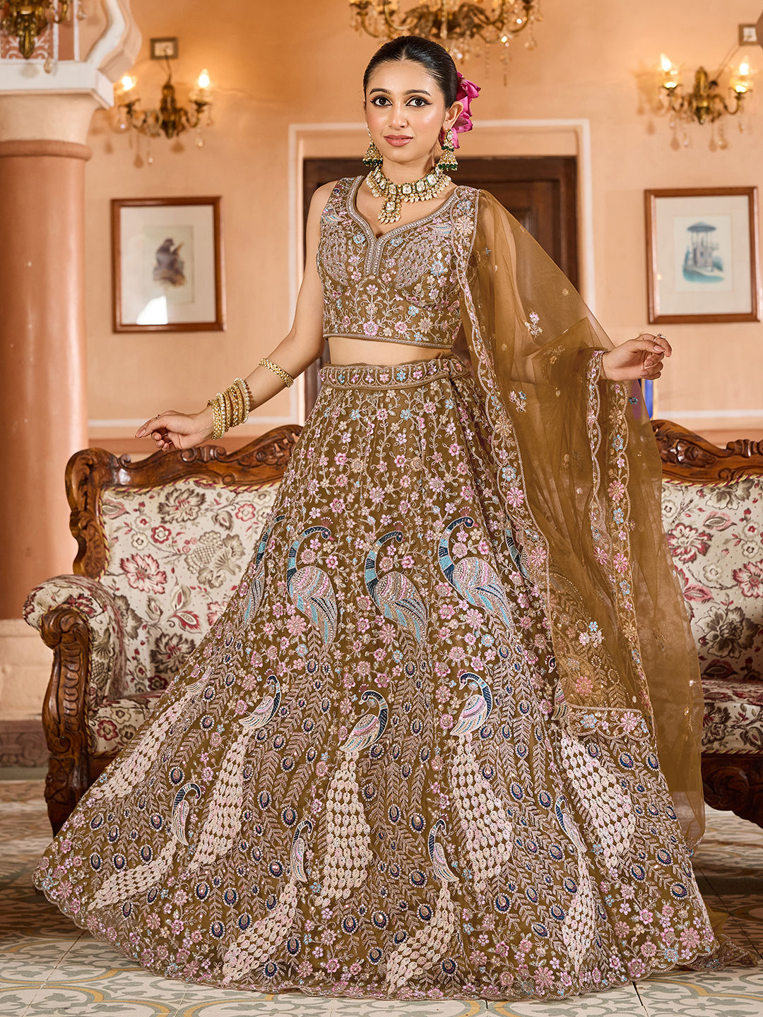 Net Wedding Lehenga in Beige and Brown with Sequence work