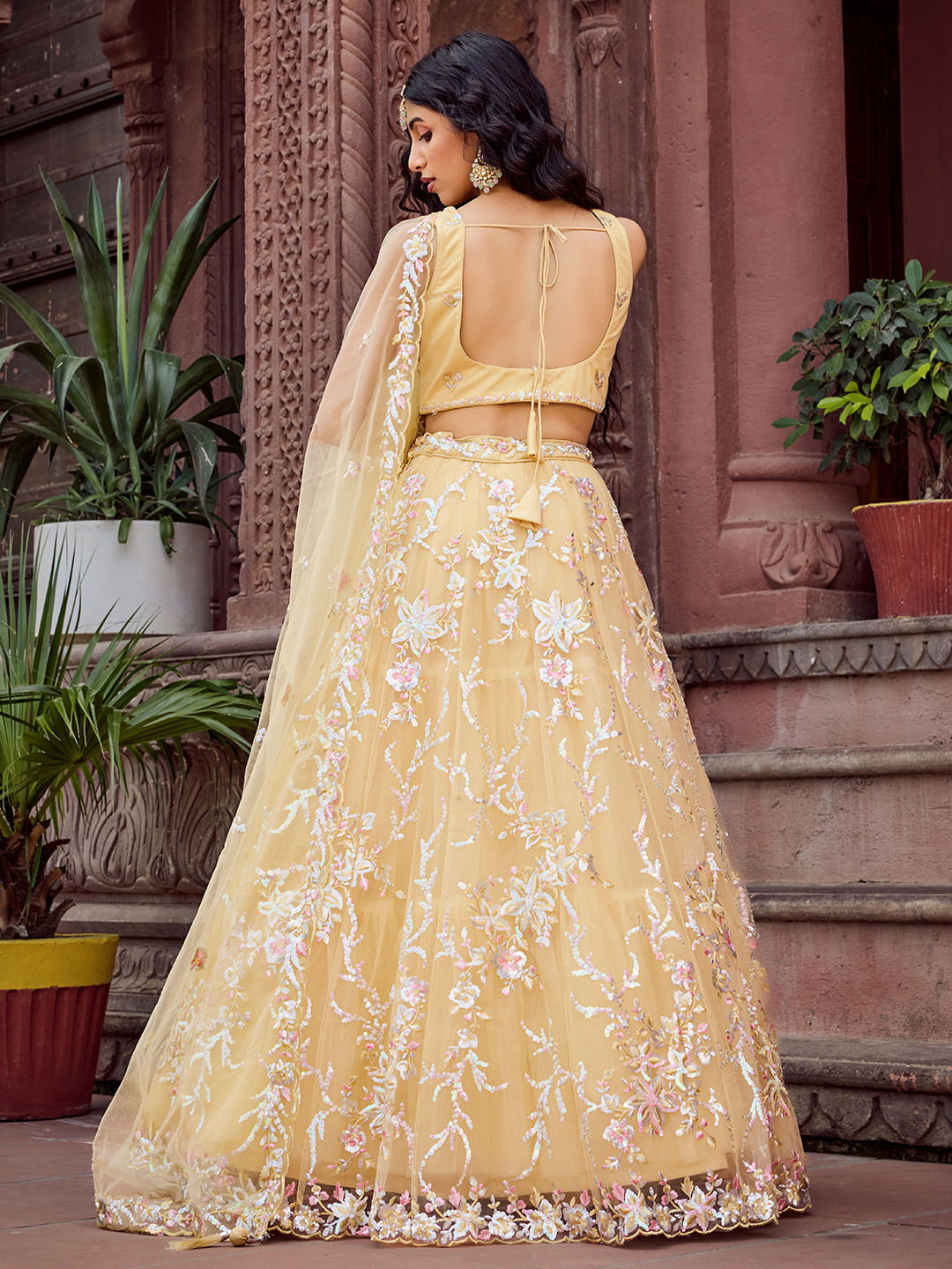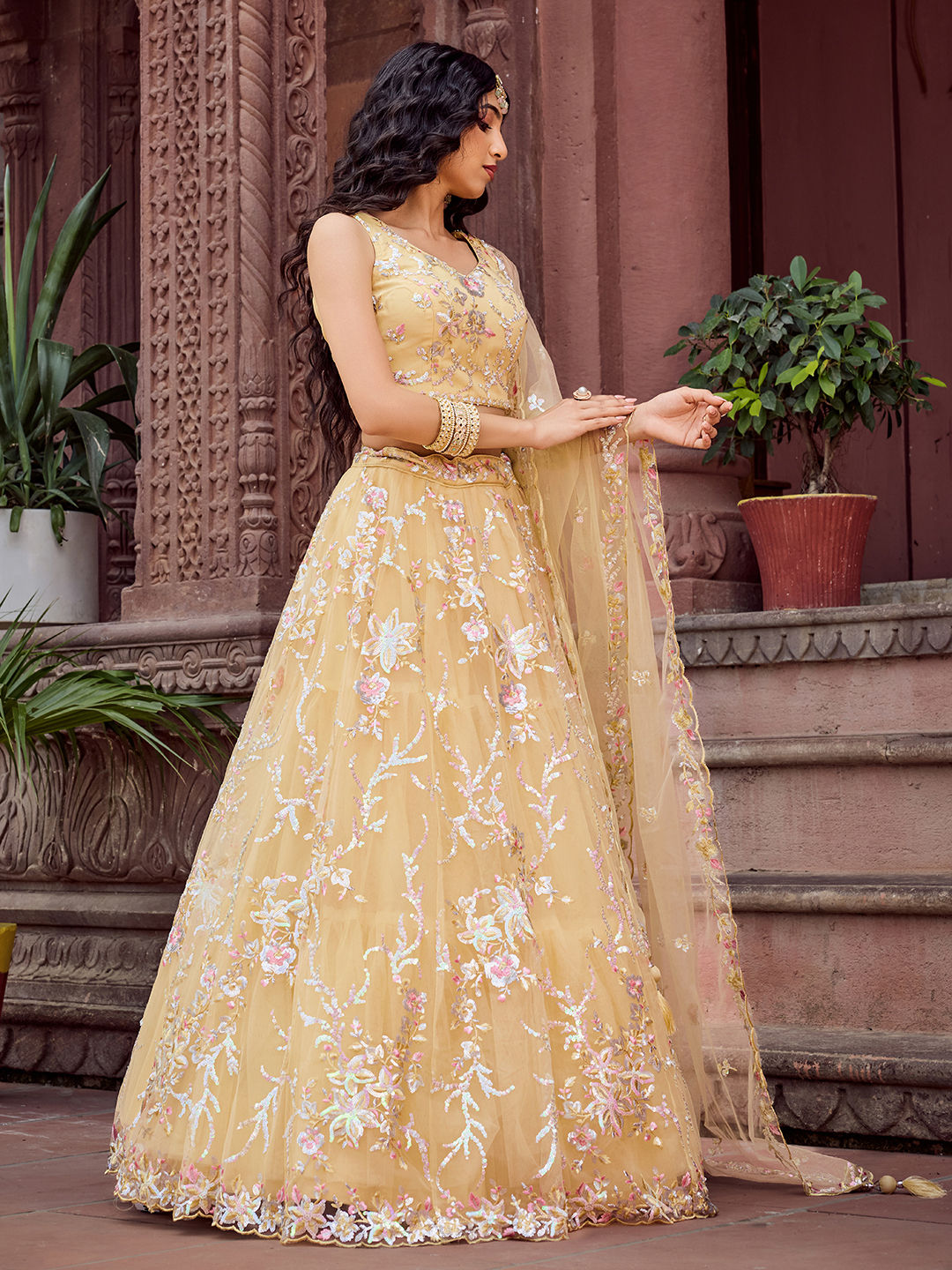 Yellow color Lehenga in Net fabric with Embroidered, Sequence work