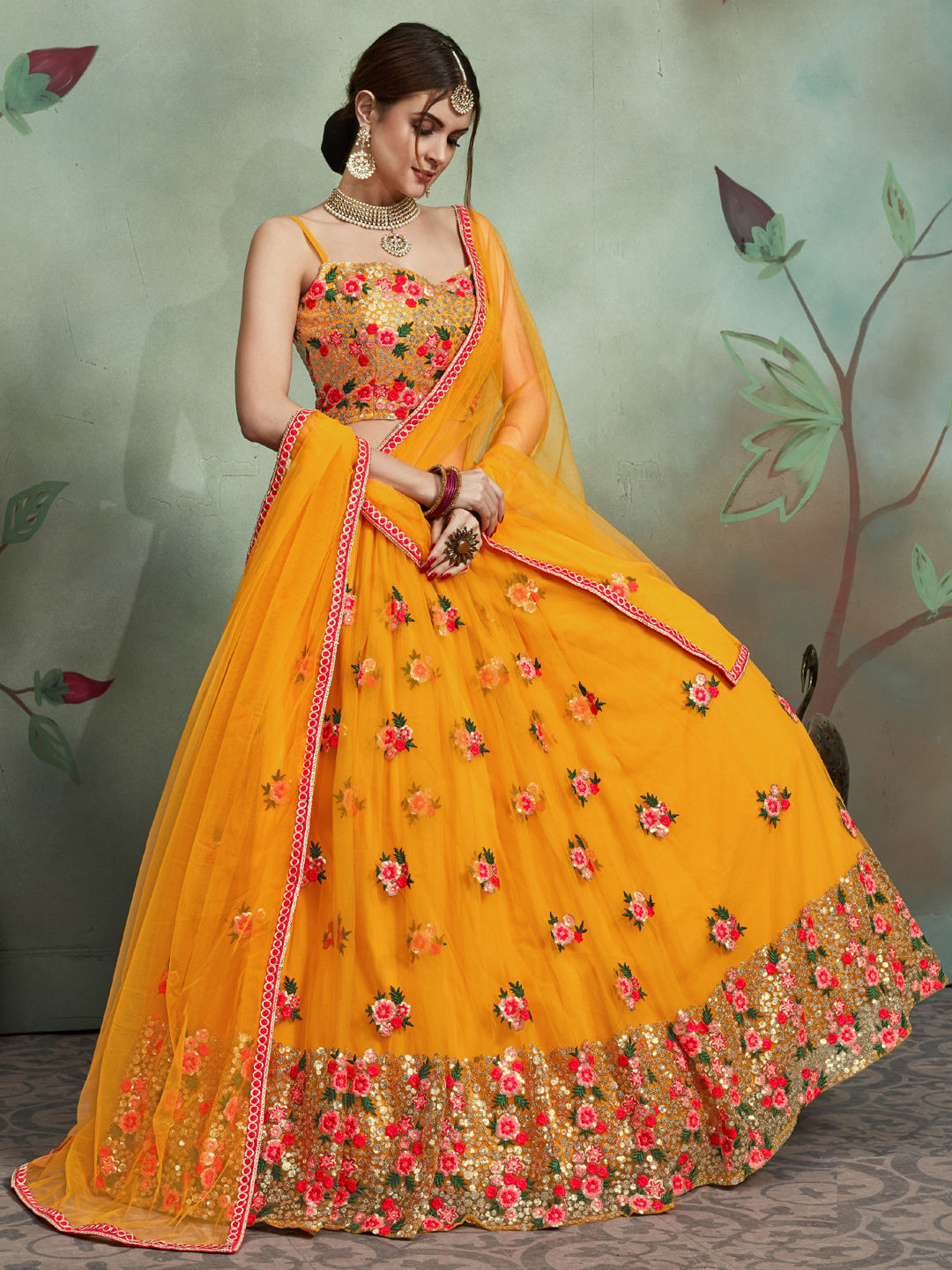 Yellow color Lehenga in Net fabric with Embroidered, Sequence, Thread work