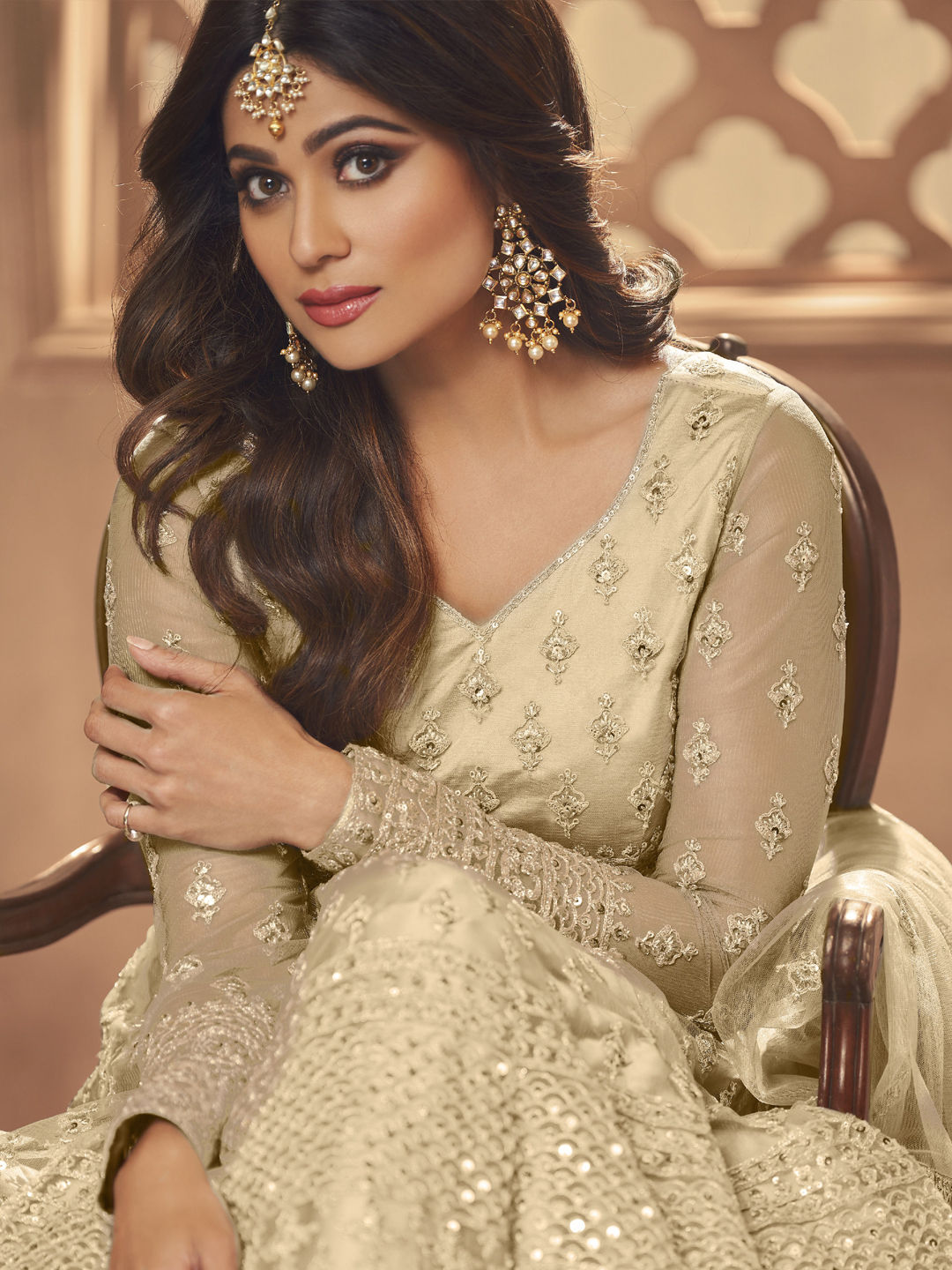 Beige and Brown color Salwar Kameez in Net fabric with Embroidered, Sequence, Thread work