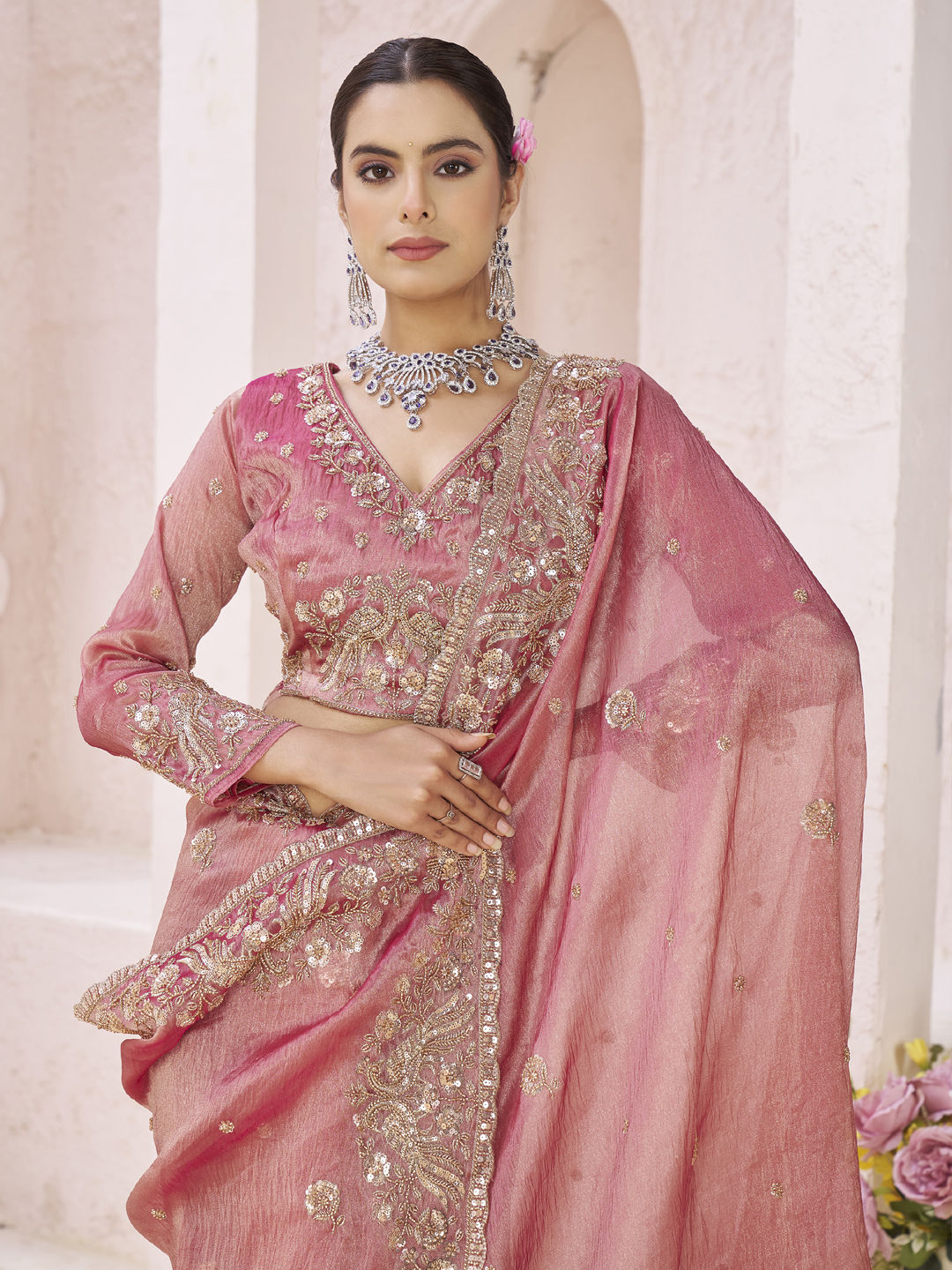 Pink and Majenta color Saree in Organza Silk, Tissue fabric with Bugle Beads, Embroidered, Sequence work
