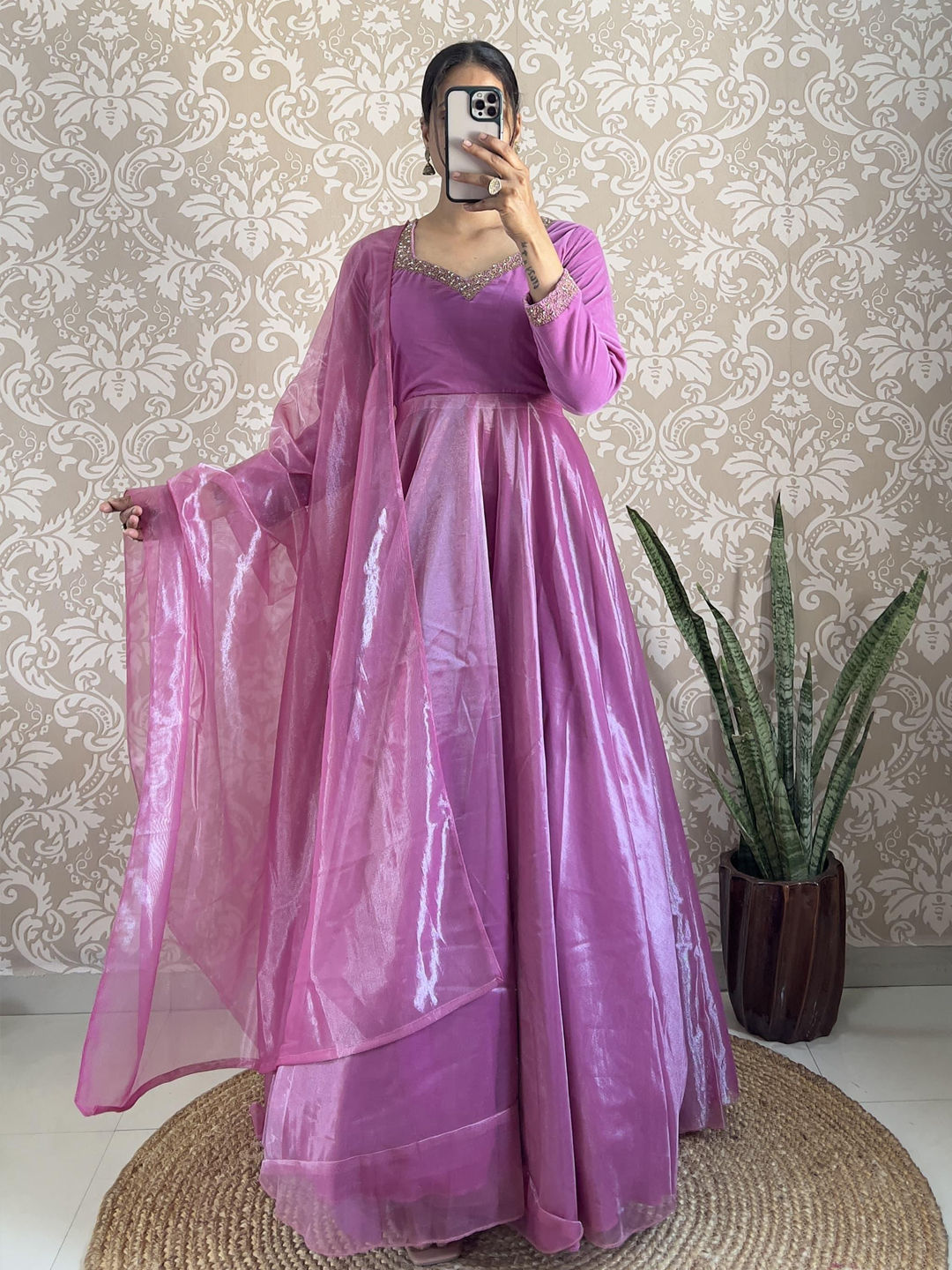 Organza Silk Festive Gown in Purple and Violet with Sequence work