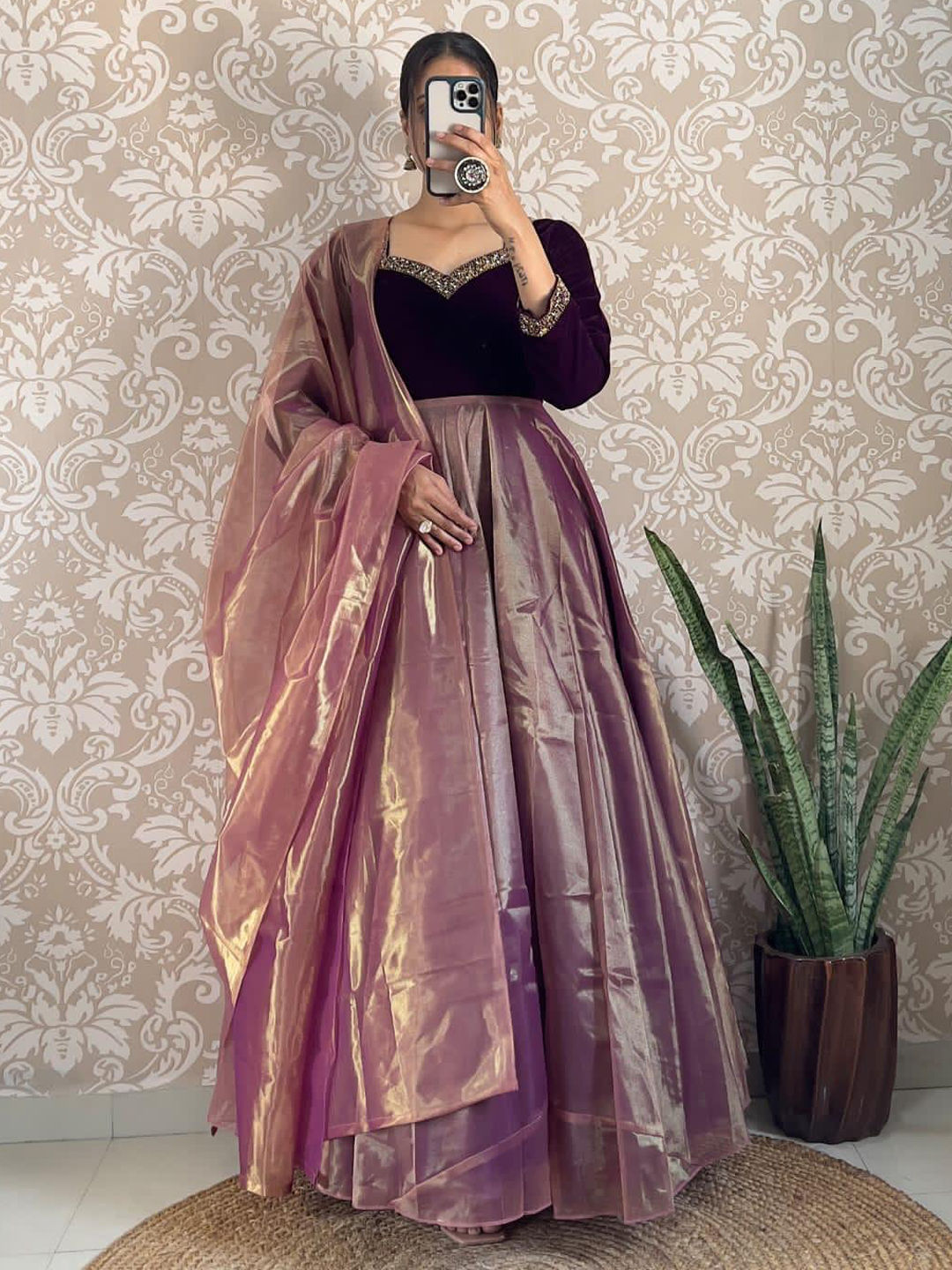 Purple and Violet color Gown in Organza Silk, Velvet fabric with Sequence work