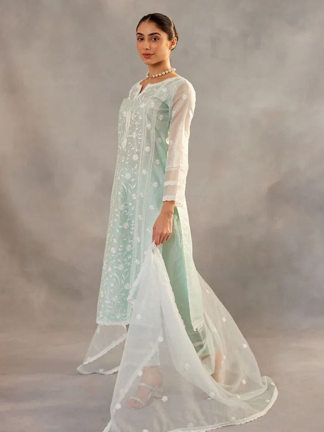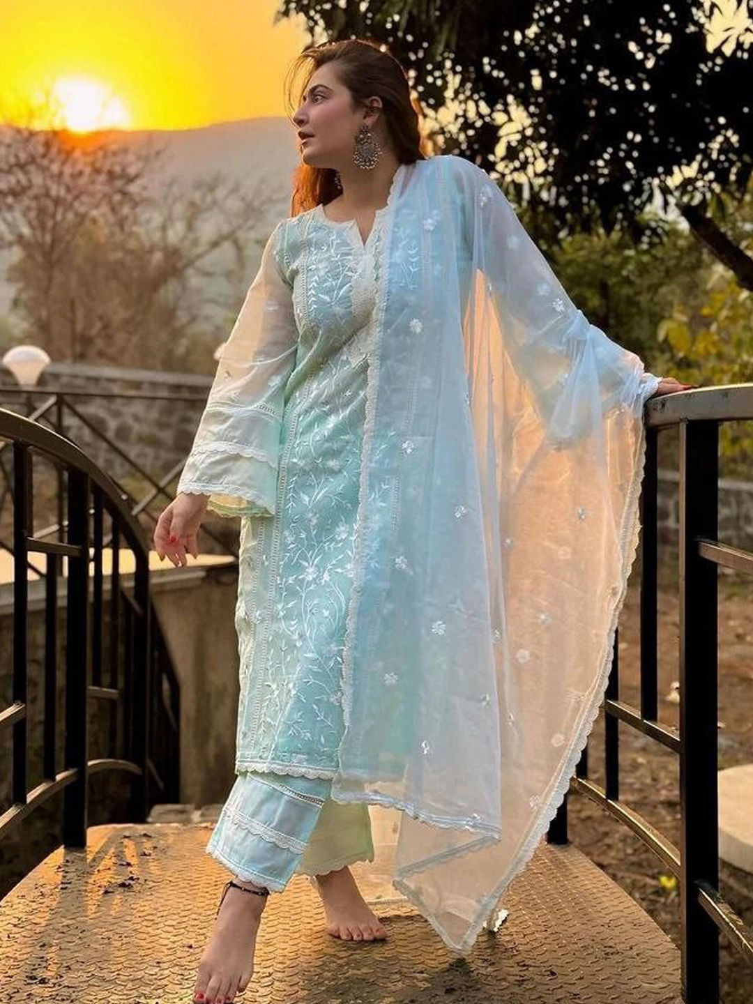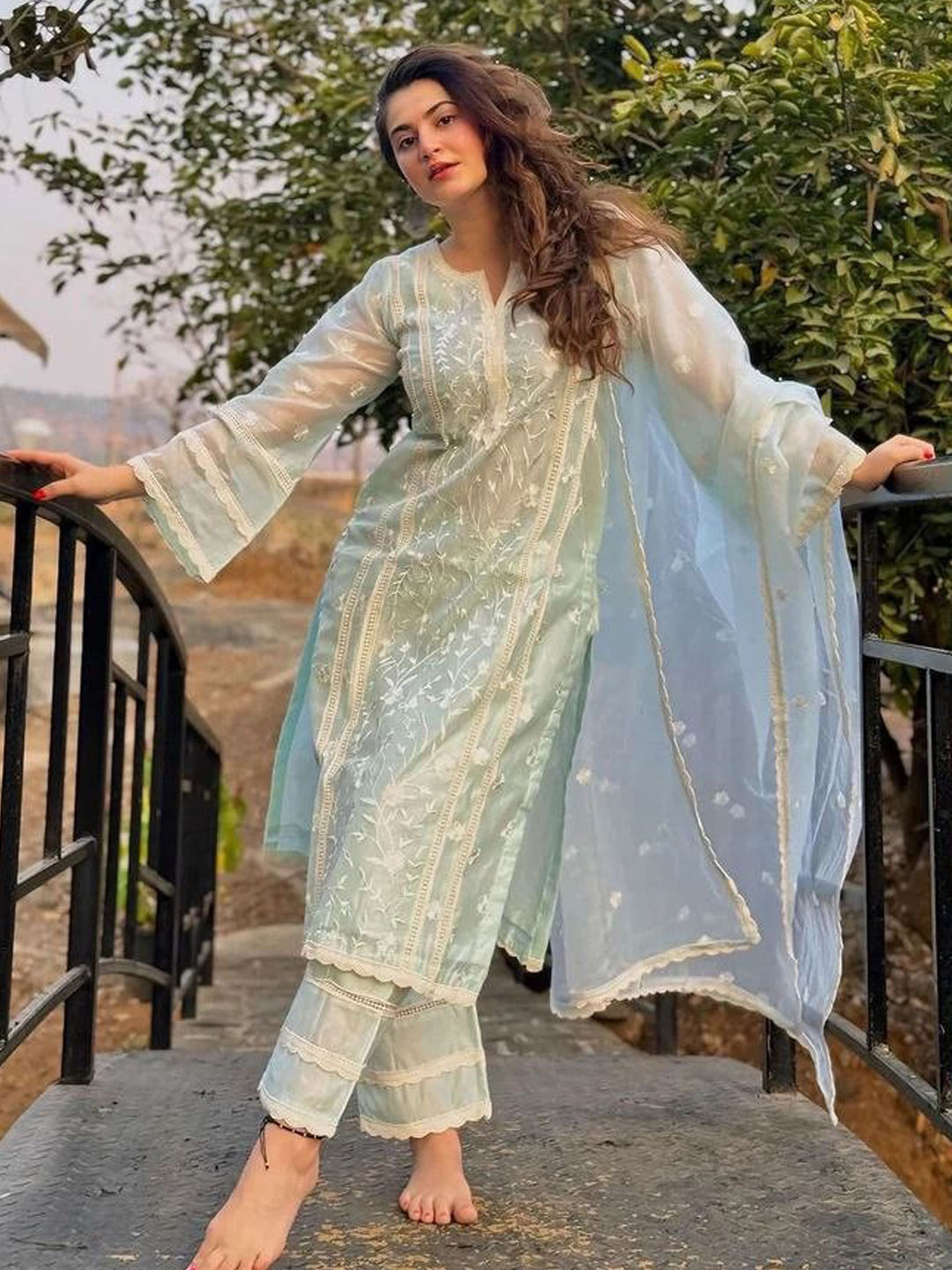 Blue color Salwar Kameez in Organza Silk fabric with Embroidered, Lace work