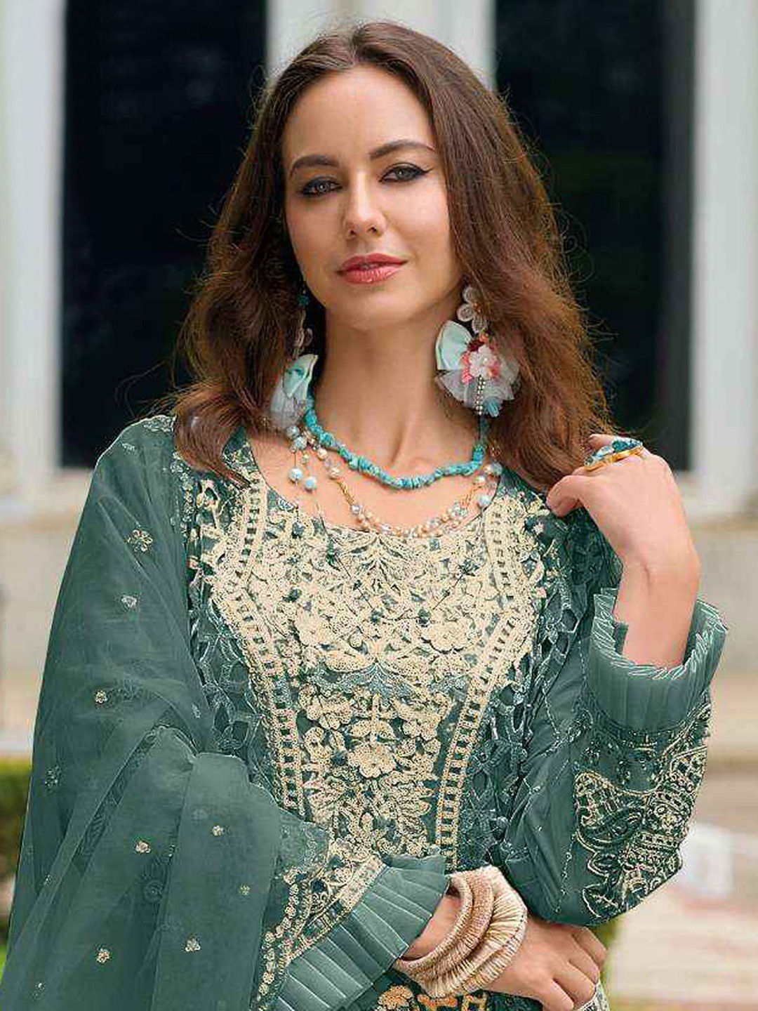 Green color Salwar Kameez in Organza Silk fabric with Embroidered, Moti, Sequence work