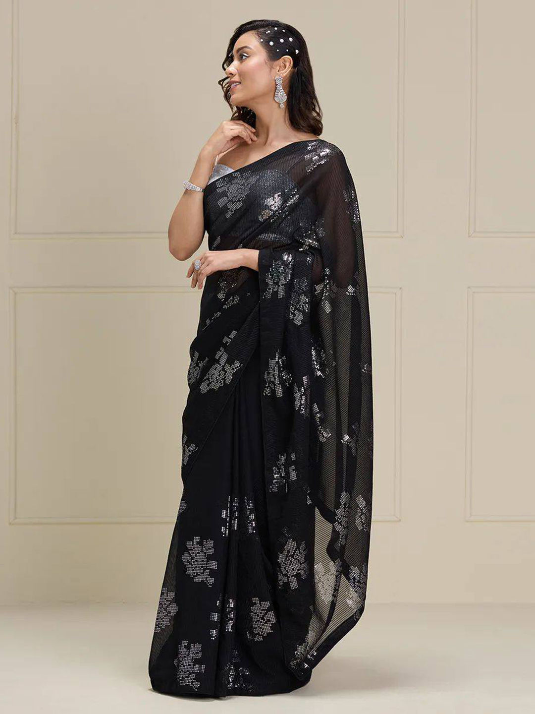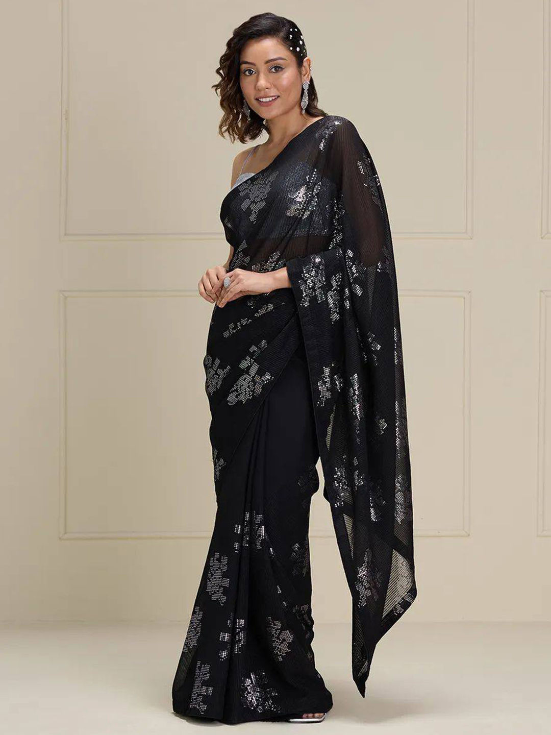 Black and Grey color Saree in Organza Silk fabric with Sequence work