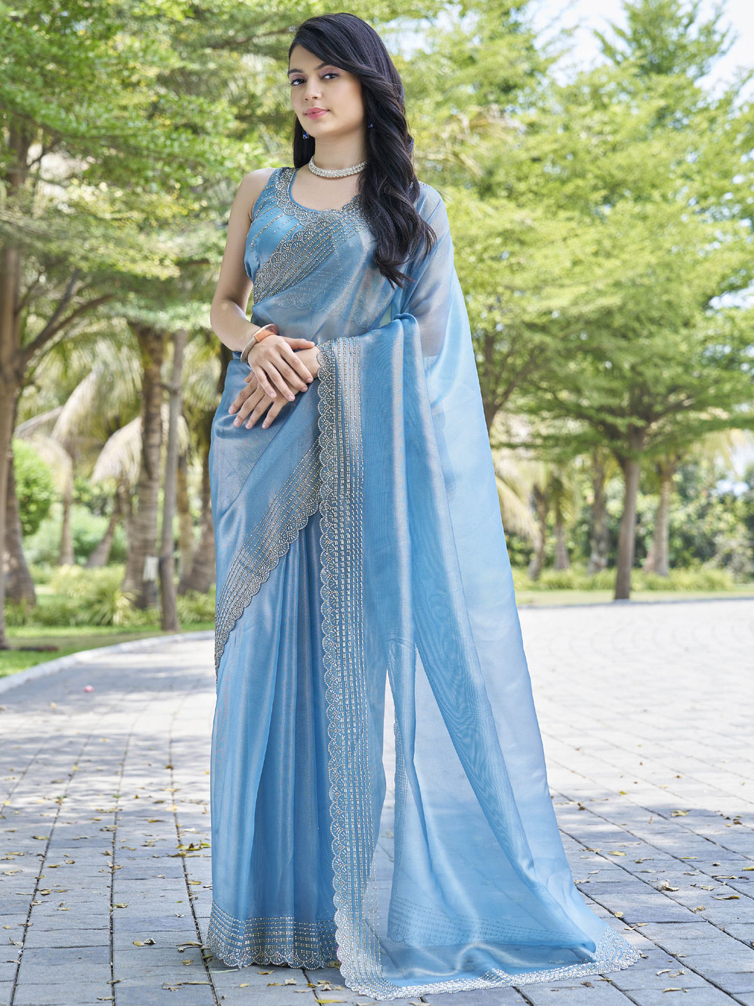 Blue color Saree in Organza Silk fabric with Cut Dana, Stone work