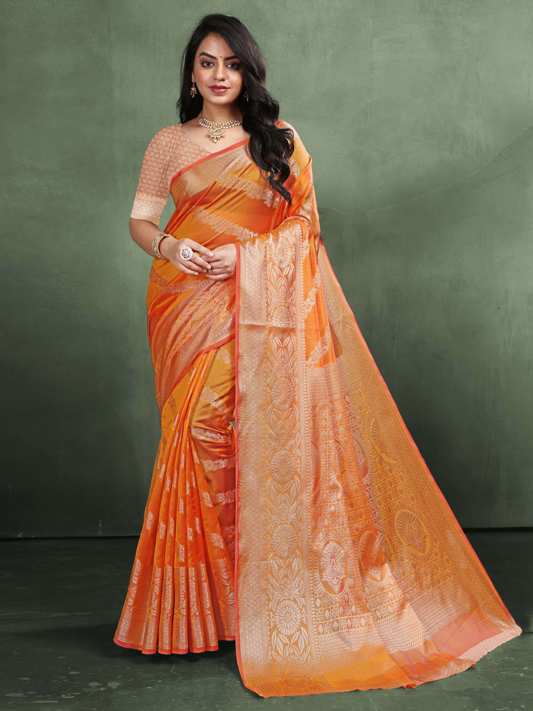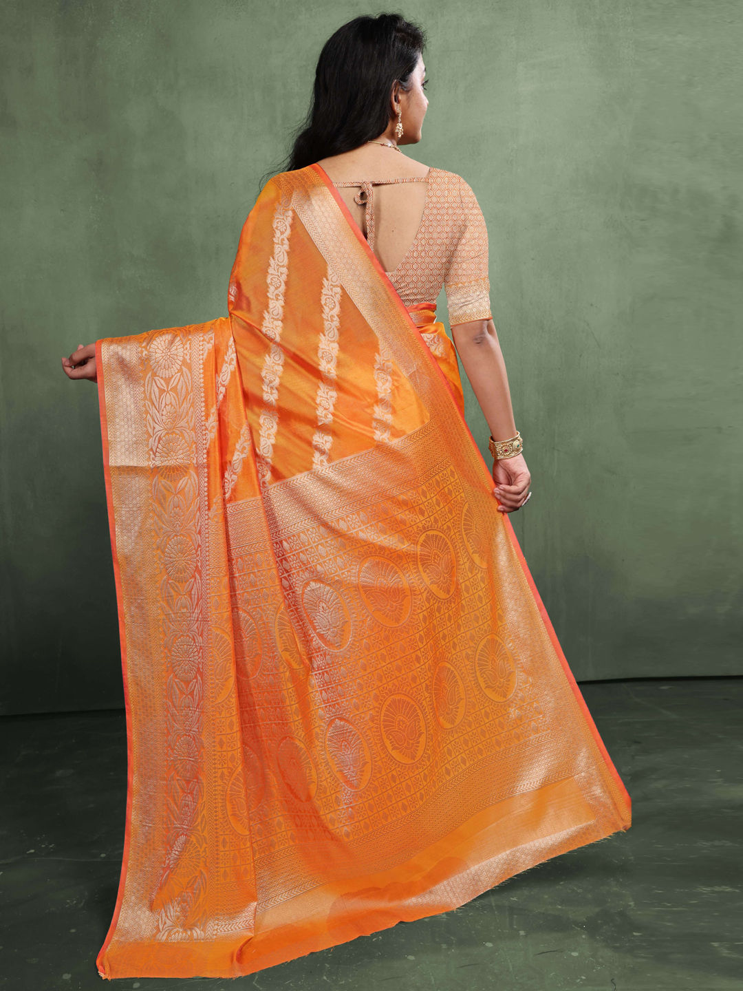 Gold color Saree in Organza Silk fabric with Weaving, Zari work