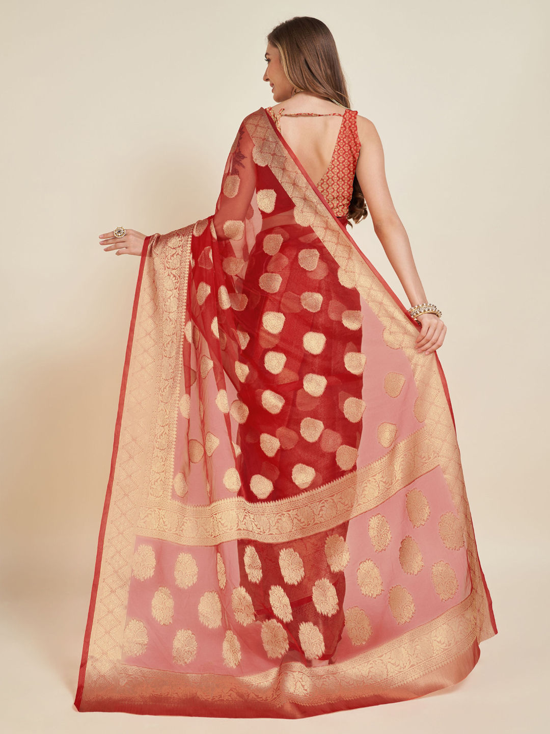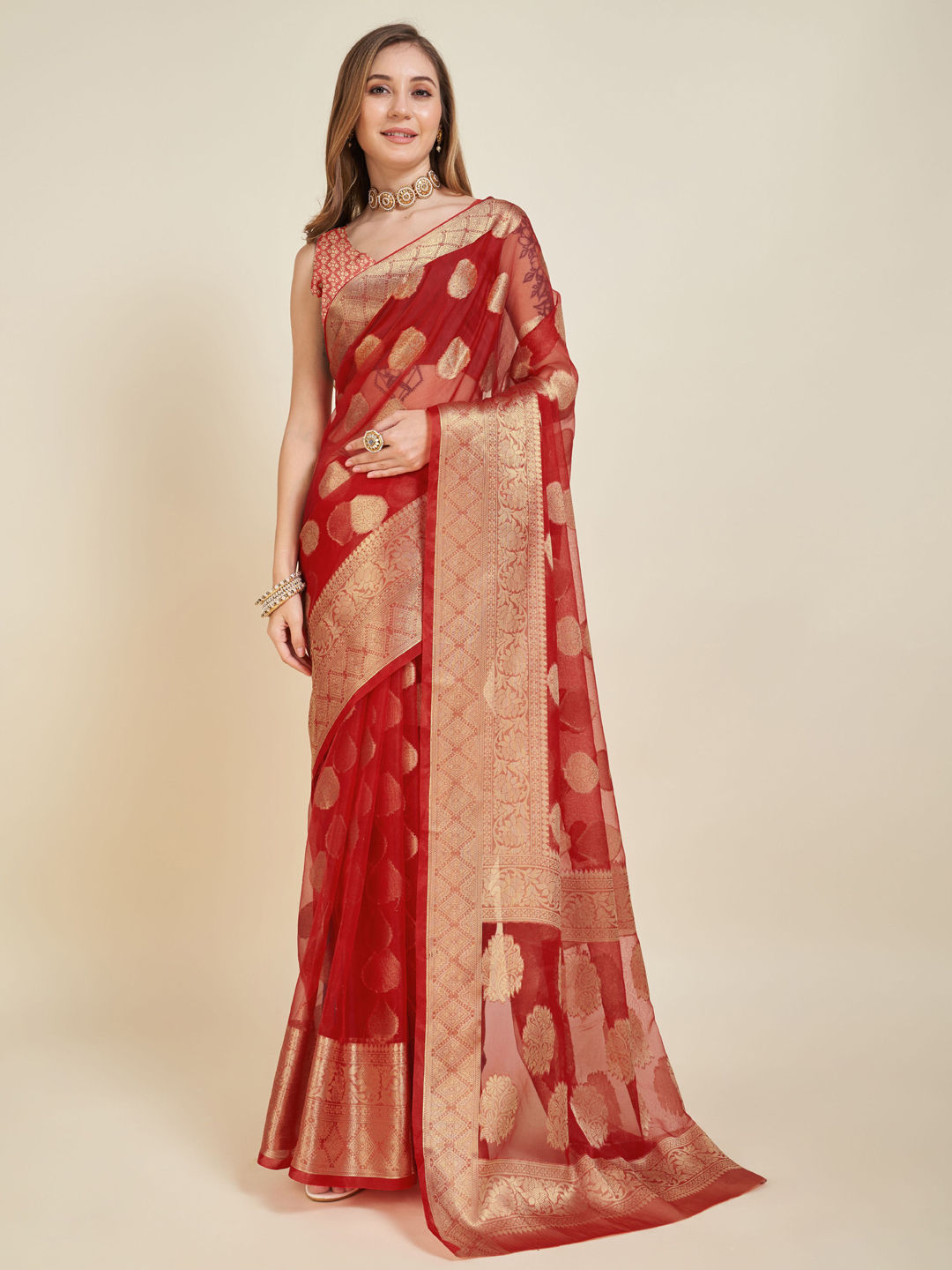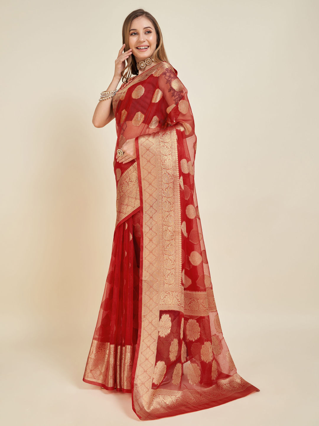 Red and Maroon color Saree in Organza Silk fabric with Weaving work