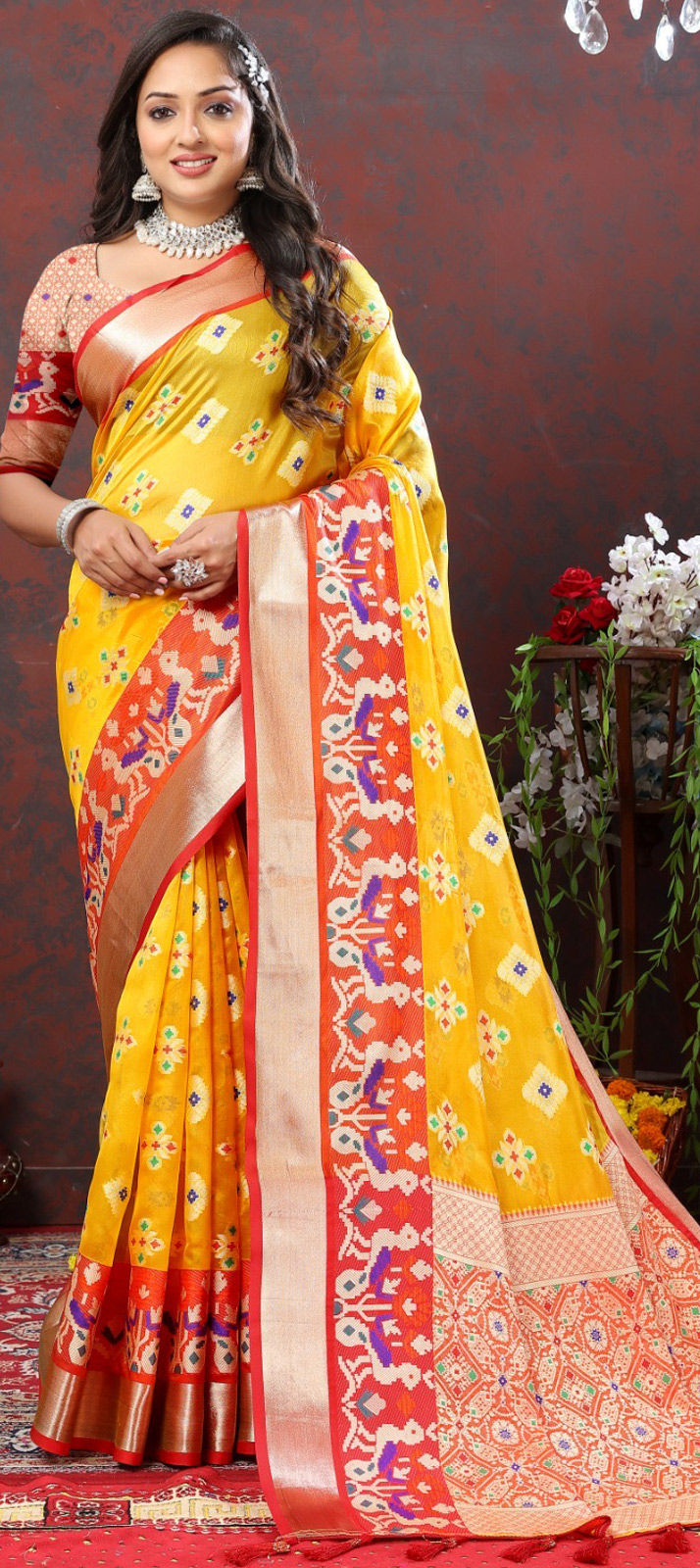 Yellow color Saree in Organza Silk fabric with Weaving, Zari work