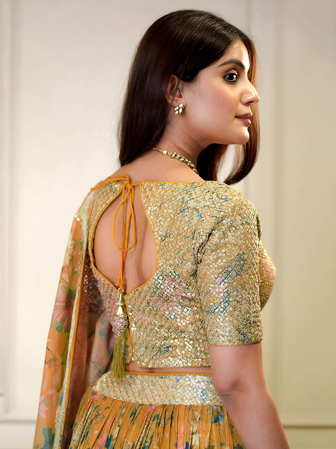 Orange color Lehenga in Organza Silk fabric with Digital Print, Embroidered, Floral, Sequence, Zari work