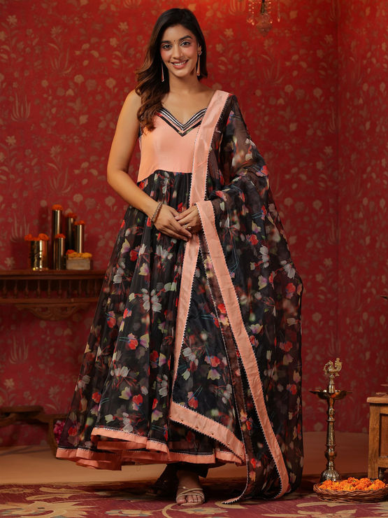 Black and Grey color Salwar Kameez in Organza Silk fabric with Printed work
