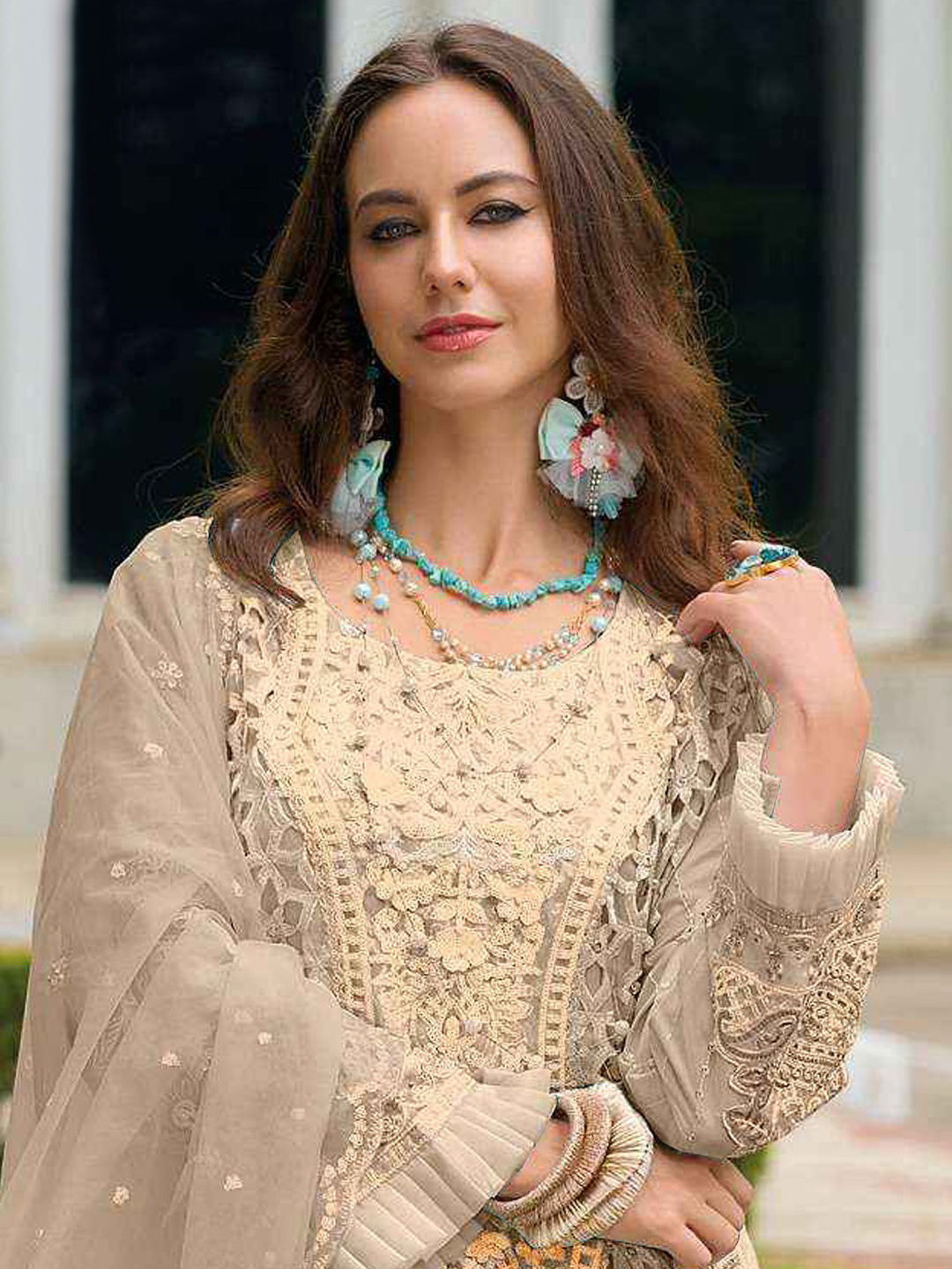 Beige and Brown color Salwar Kameez in Organza Silk fabric with Embroidered, Moti, Sequence work