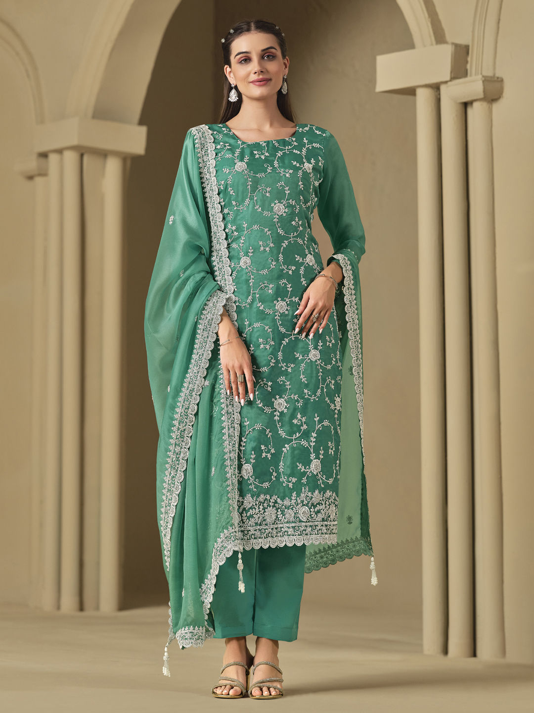 Green color Salwar Kameez in Organza Silk fabric with Embroidered, Swarovski, Thread work