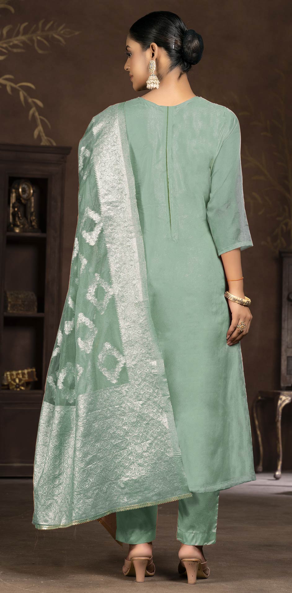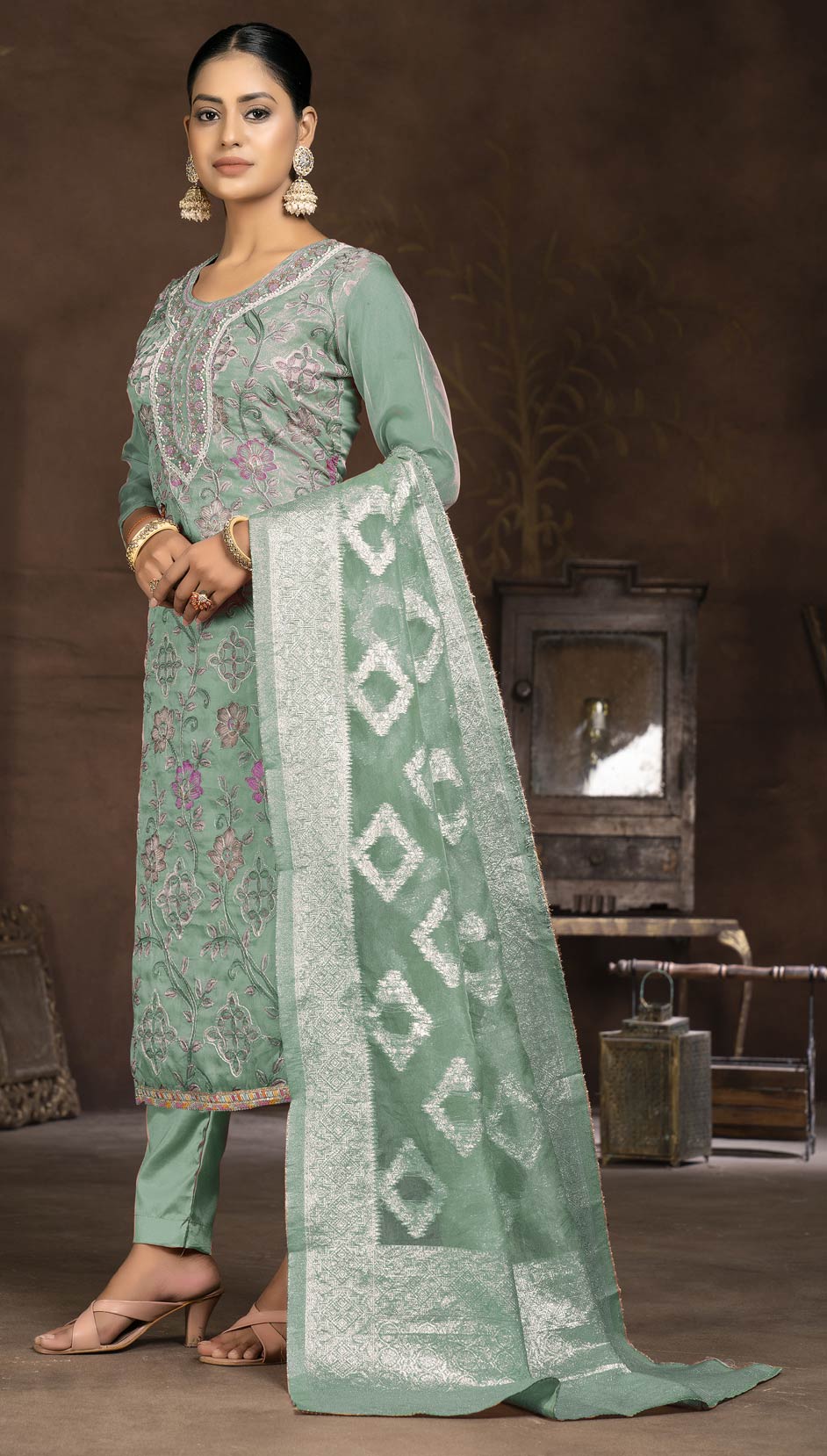 Green color Salwar Kameez in Organza Silk fabric with Embroidered, Printed, Thread work